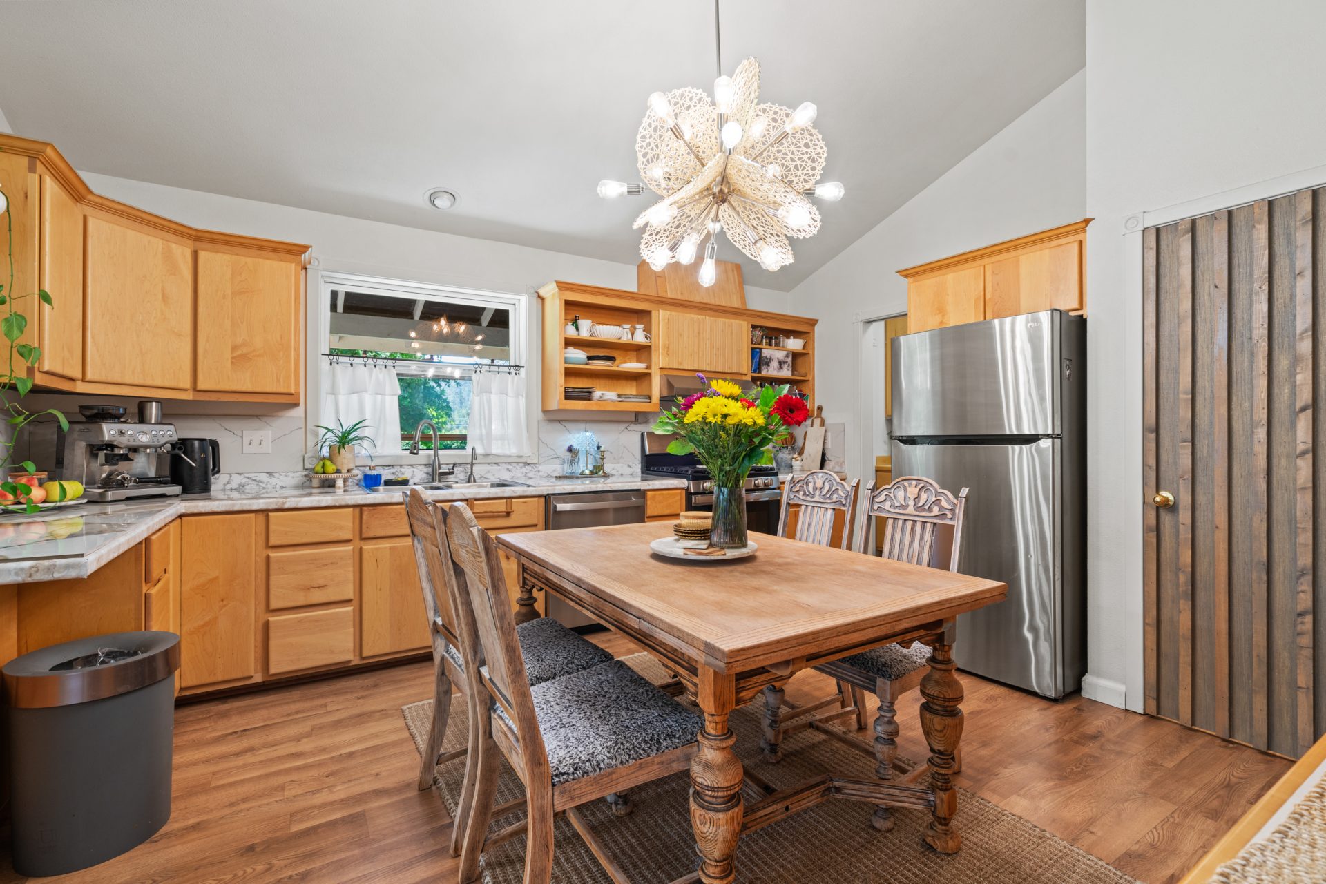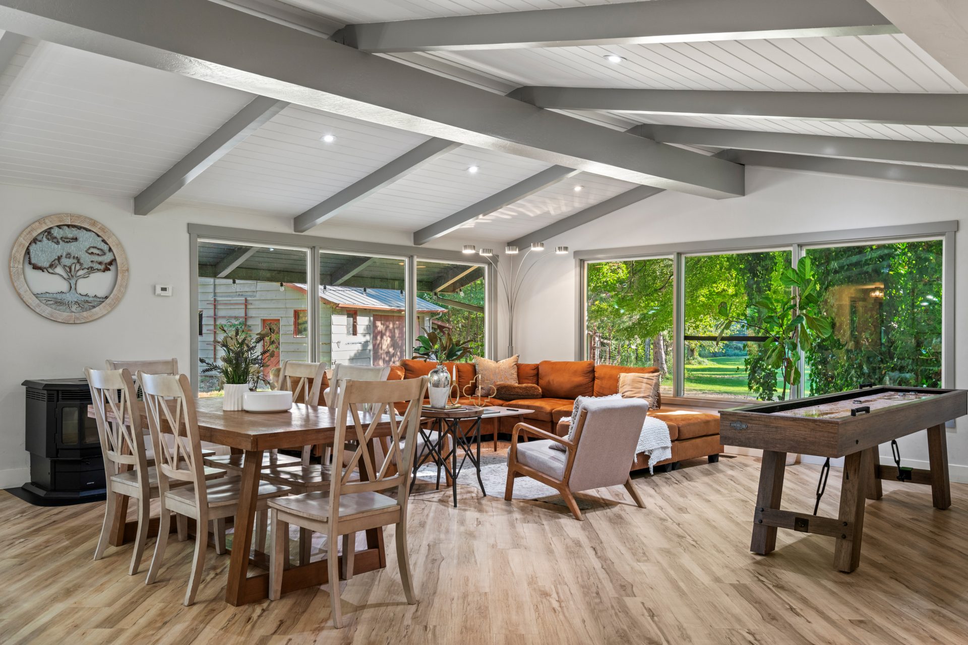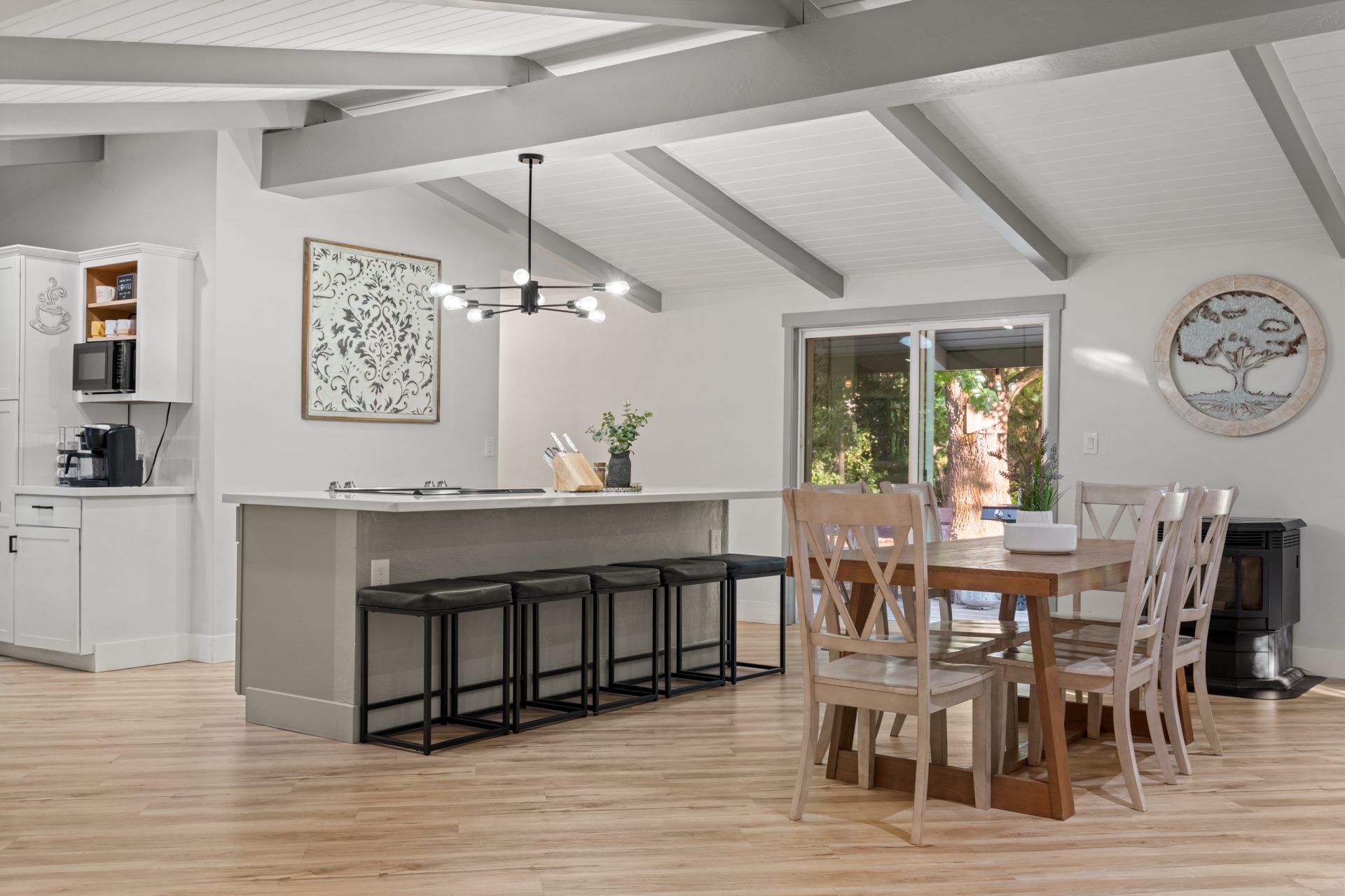Beautifully updated and offered fully furnished, the main residence balances rustic warmth with refined design. A vaulted great room with exposed beams welcomes you in, filled with light and centered around a cozy pellet stove. The open-concept kitchen, living, and dining areas flow seamlessly, creating a space that feels both inviting and functional.