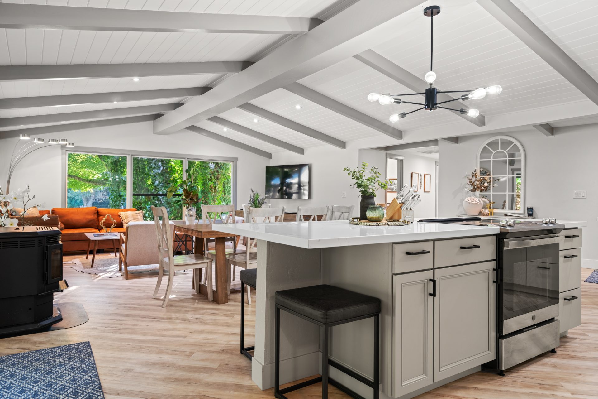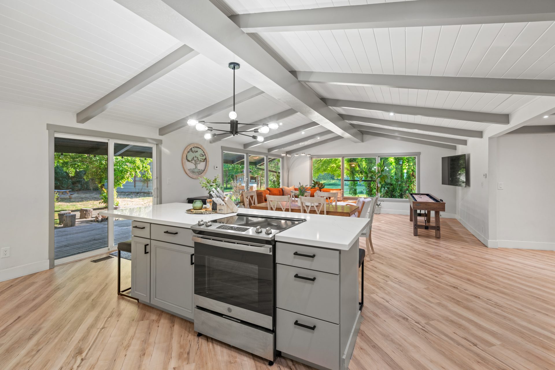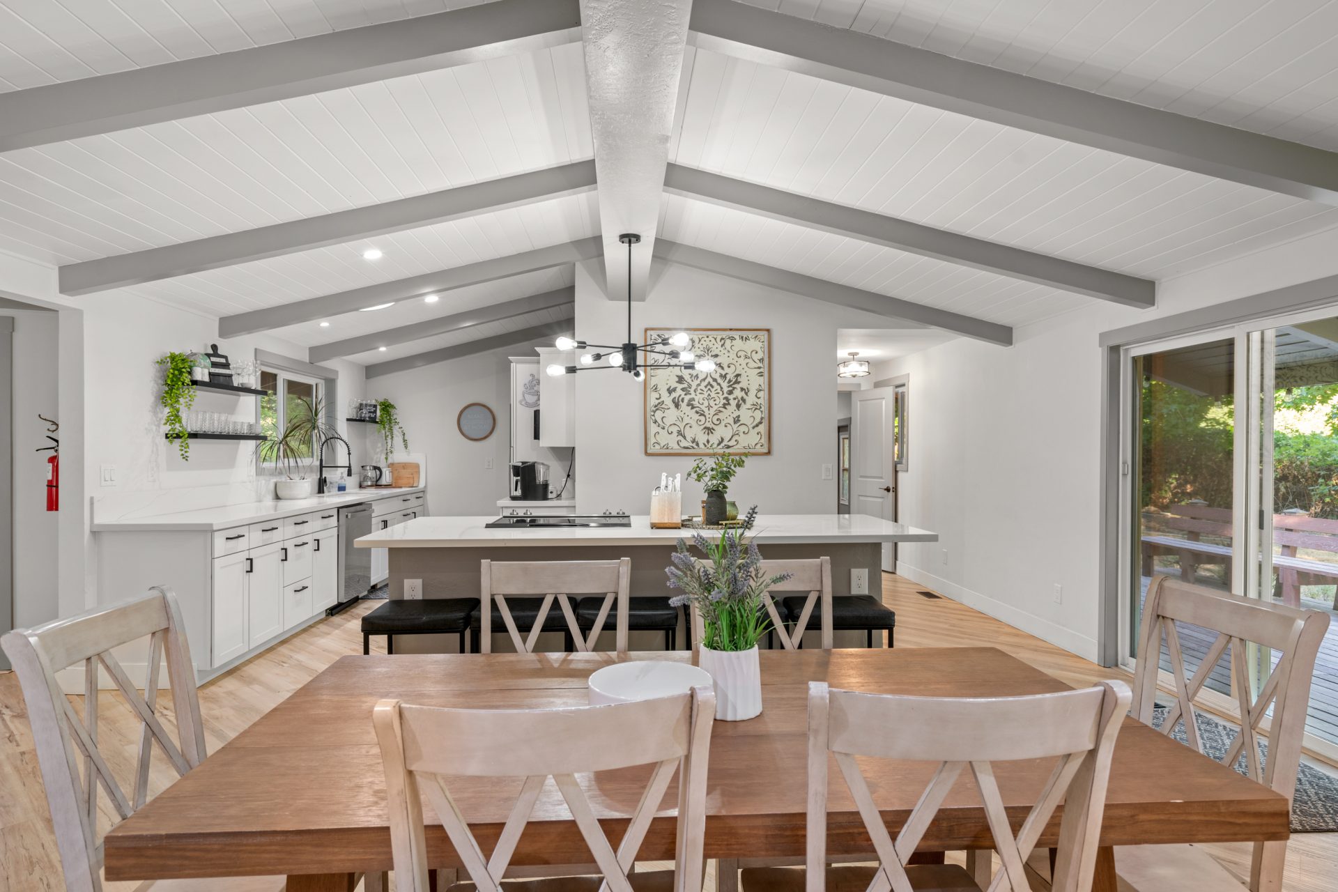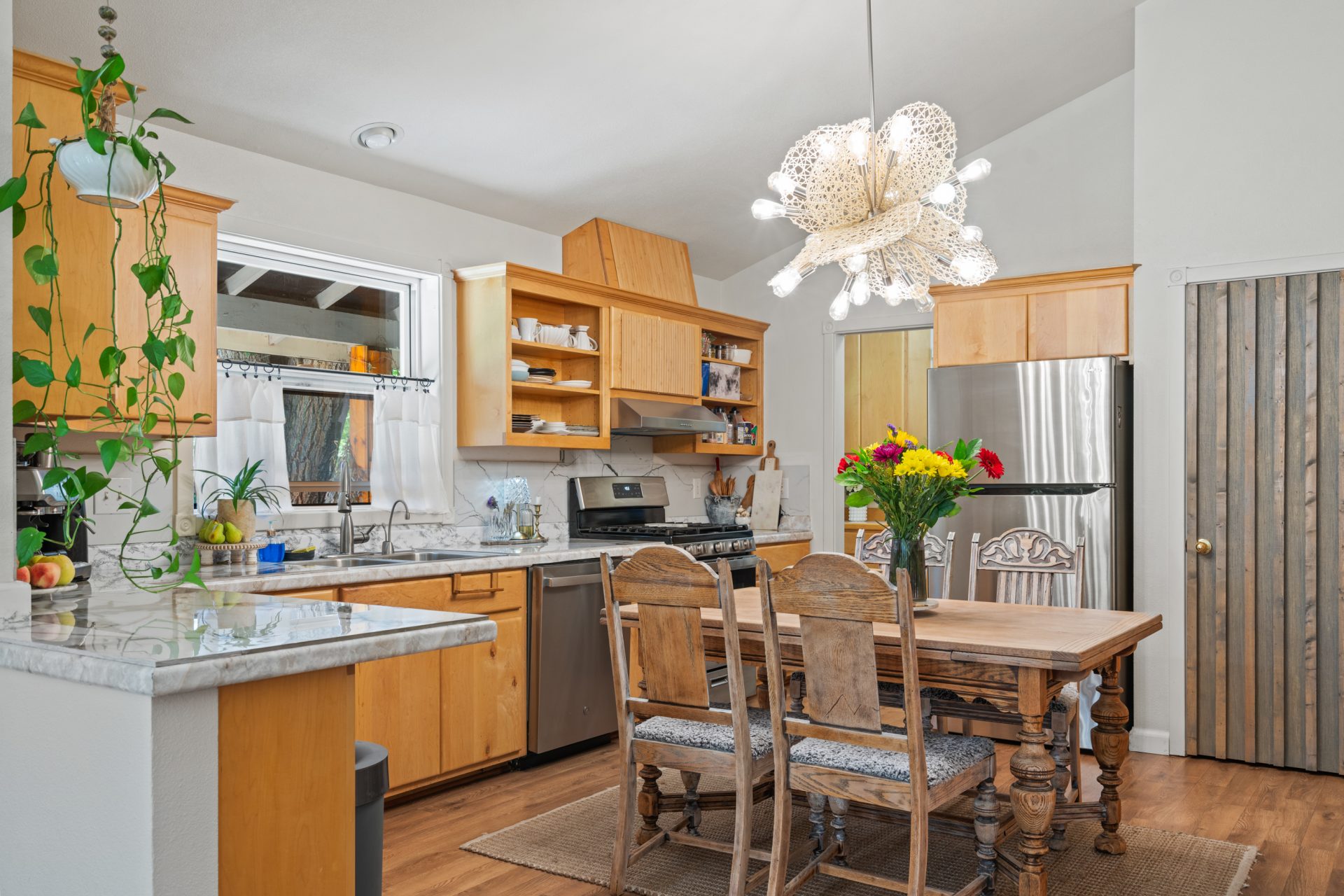 Beautifully updated and offered fully furnished, the main residence balances rustic warmth with refined design. A vaulted great room with exposed beams welcomes you in, filled with light and centered around a cozy pellet stove. The open-concept kitchen, living, and dining areas flow seamlessly, creating a space that feels both inviting and functional.