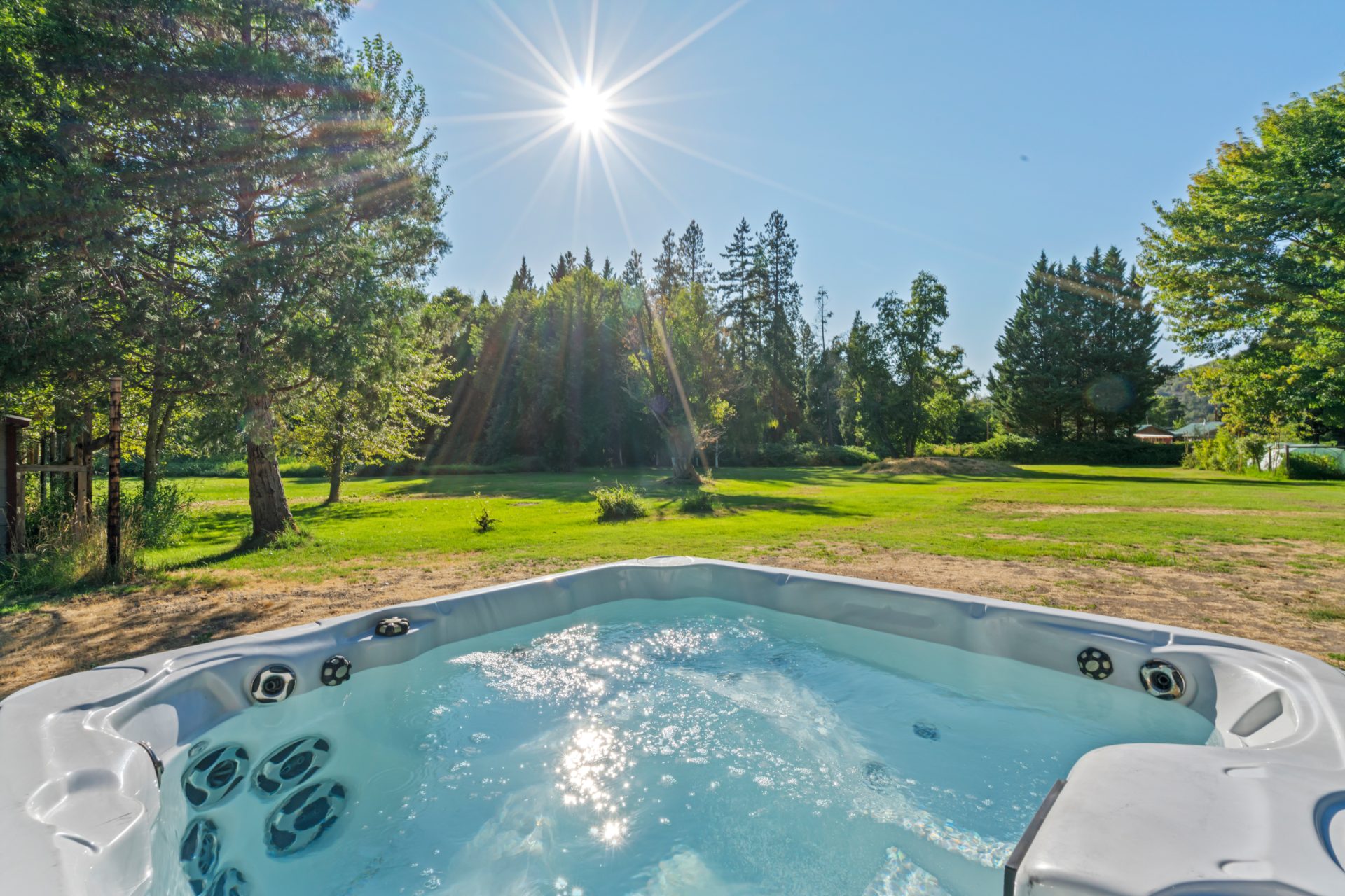 Outdoor living shines here, with a private deck and patio overlooking the lawns and river, complete with a hot tub, BBQ area, and fire ring. A detached two-car garage sits conveniently beside the home.