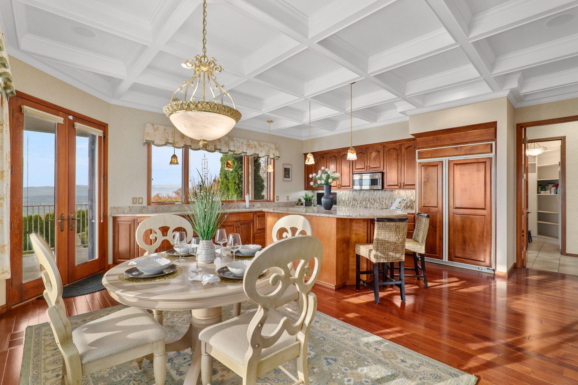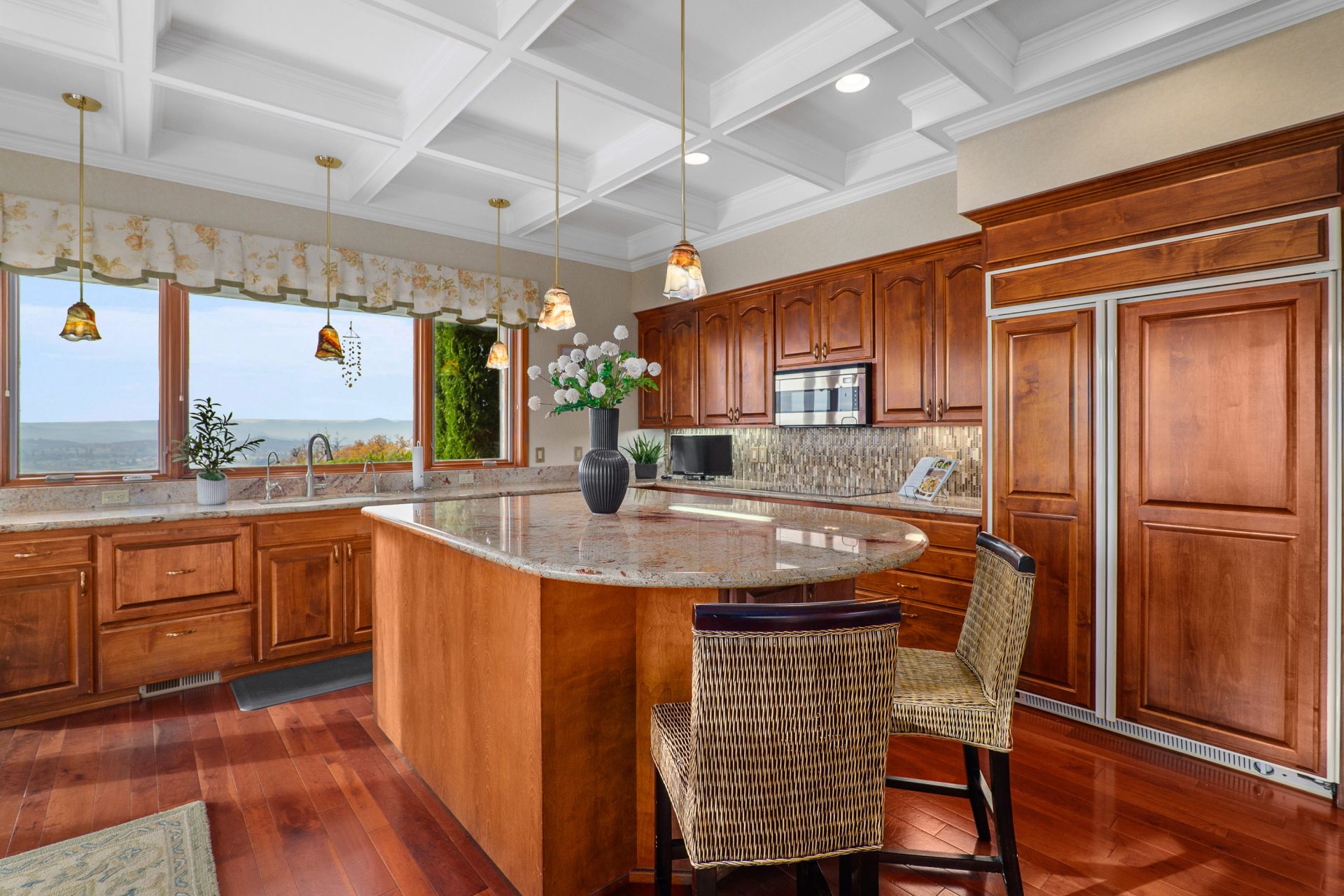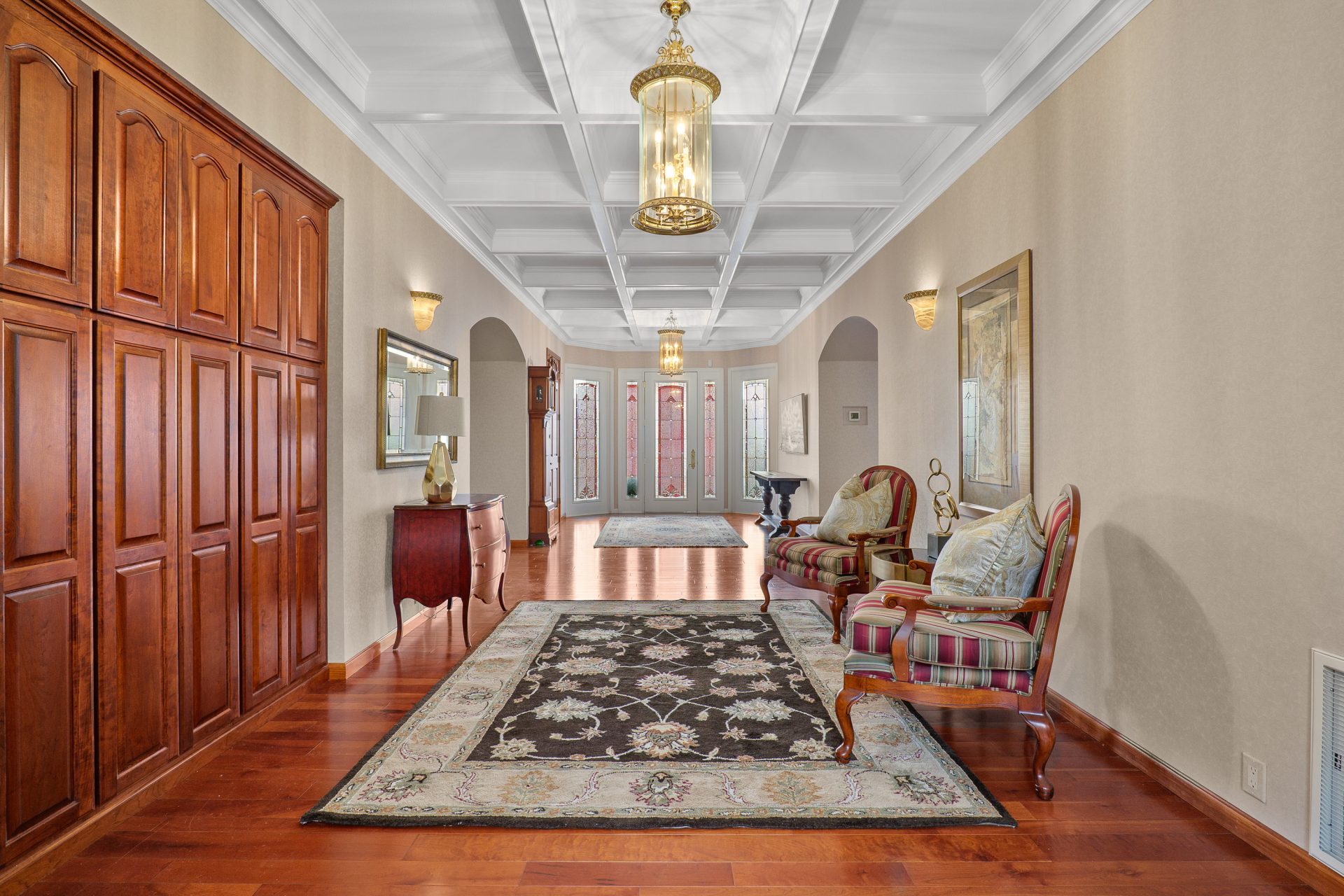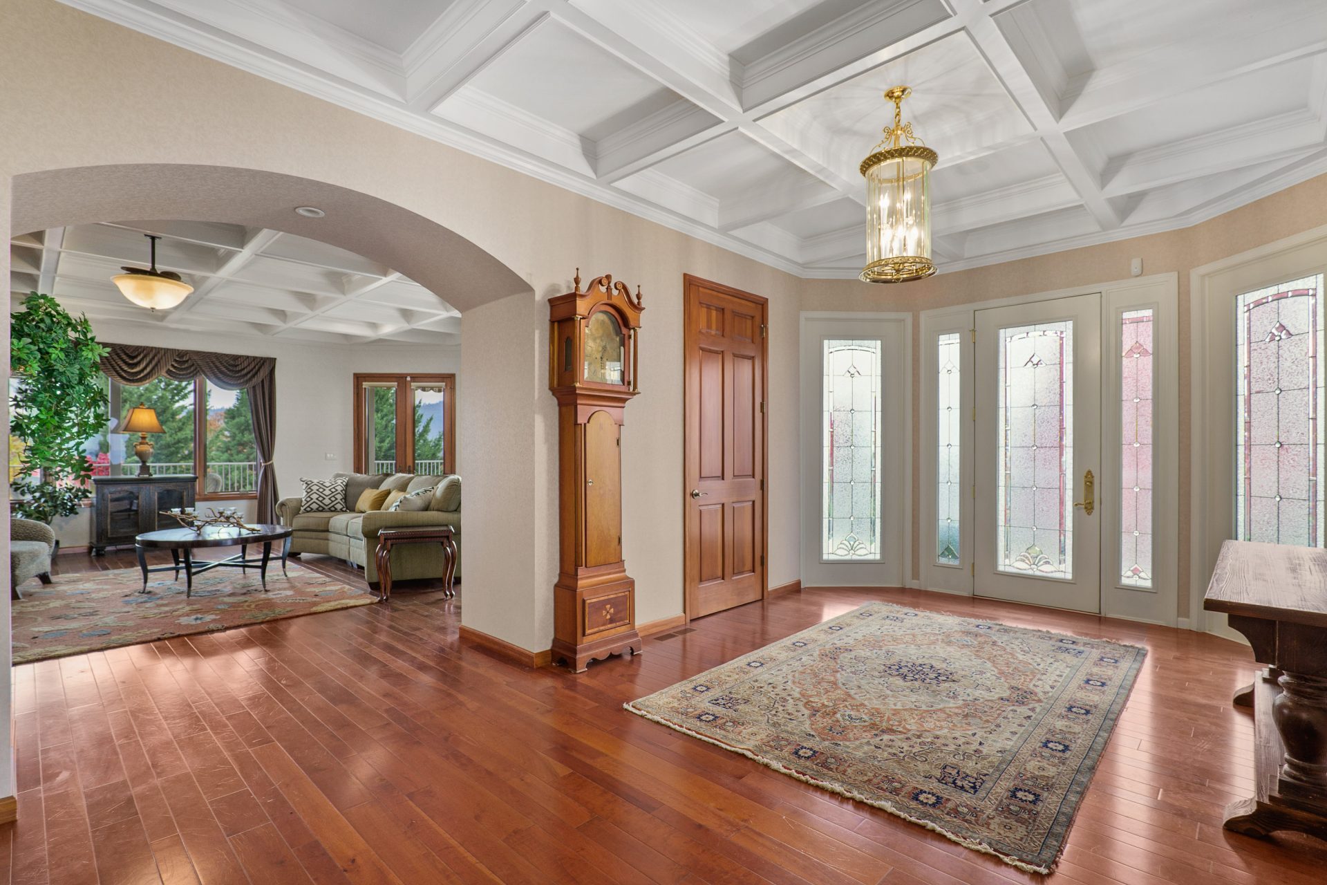 Inside, the home’s craftsmanship shines through every detail — from rich cherry hardwood floors and custom wood-trimmed windows to extensive built-in cabinetry and coffered ceilings. The grand living room serves as the heart of the home, featuring a propane fireplace, luxurious finishes, and natural light that fills the space throughout the day.