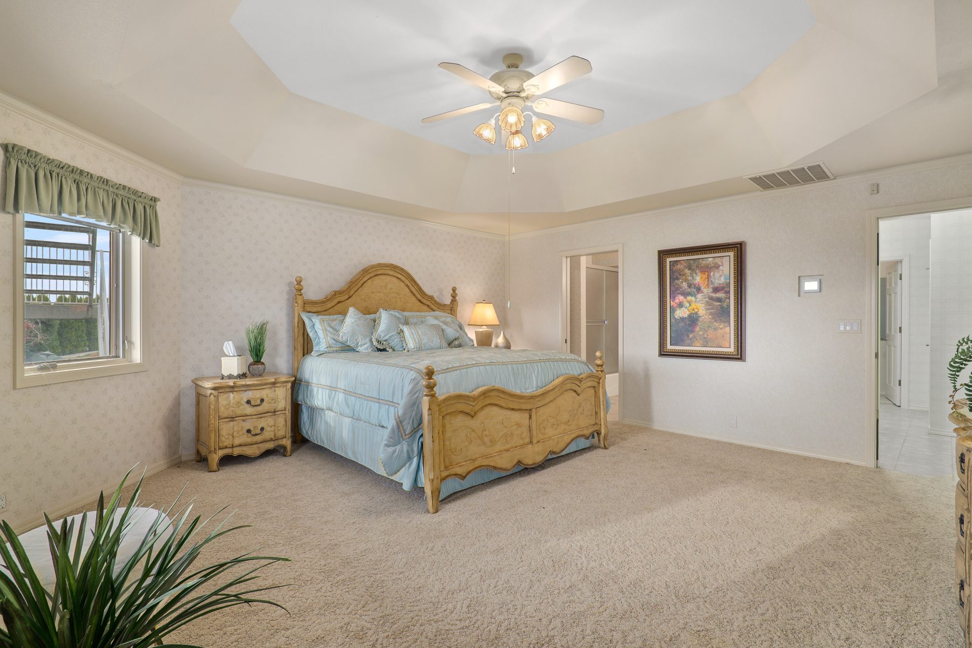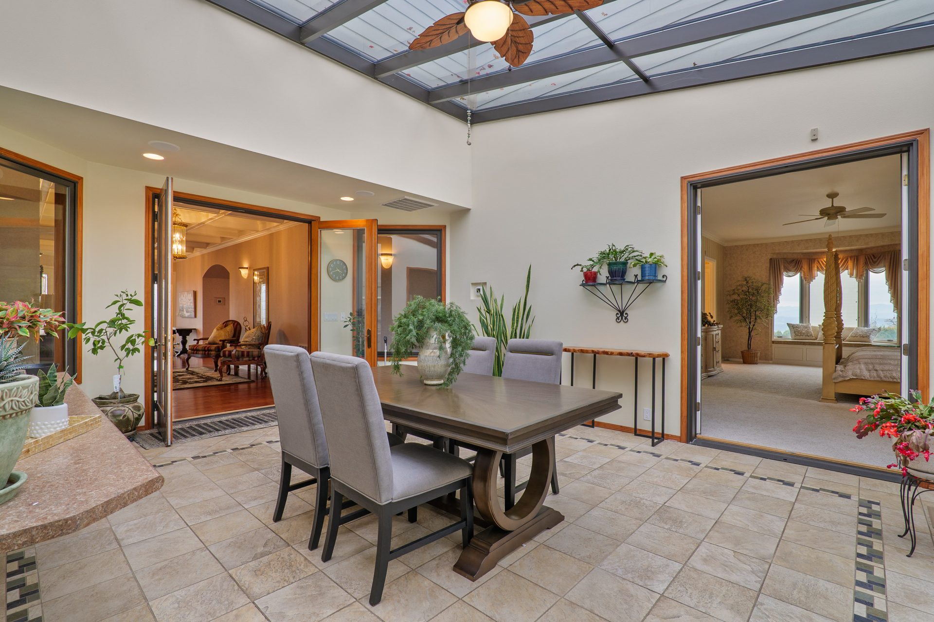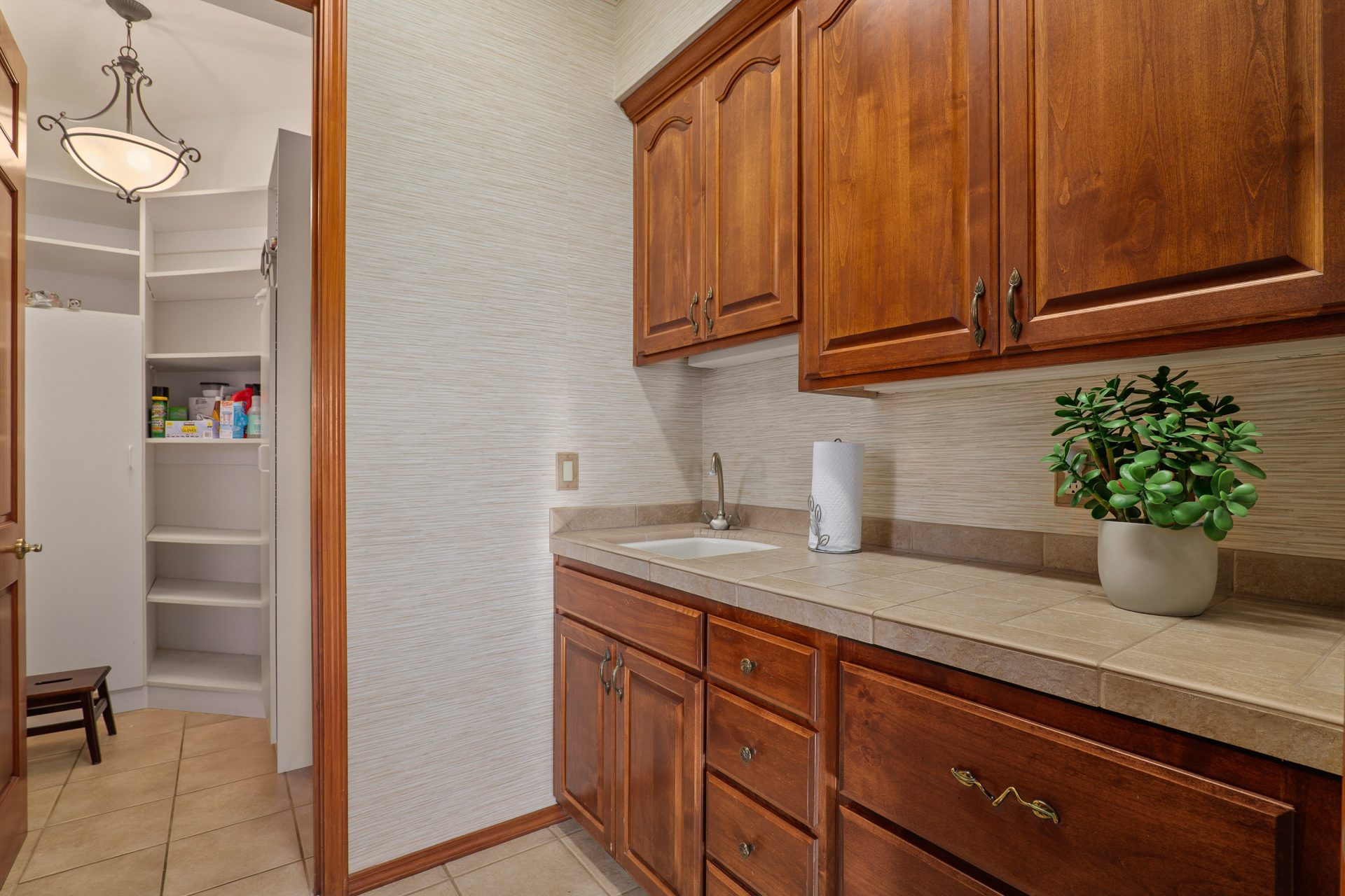 The kitchen was designed for both form and function, offering granite countertops, a large center island, walk-in pantry, and a separate butler’s pantry with sink — perfect for entertaining. The layout flows seamlessly into the dining and living areas, as well as to an atrium-style courtyard at the center of the home. This private outdoor space features a tranquil water feature and built-in BBQ/outdoor kitchen, creating an ideal setting for morning coffee, evening gatherings, or quiet reflection.