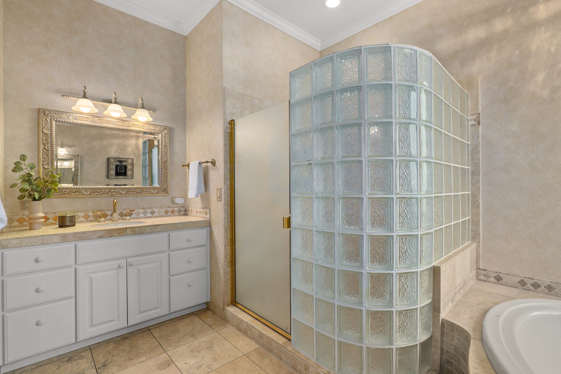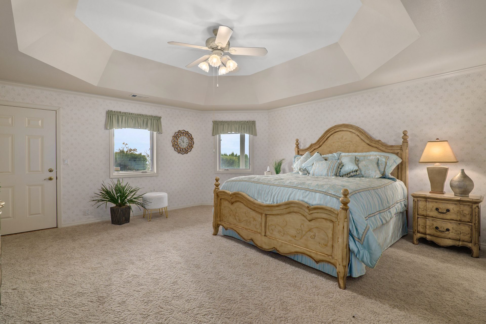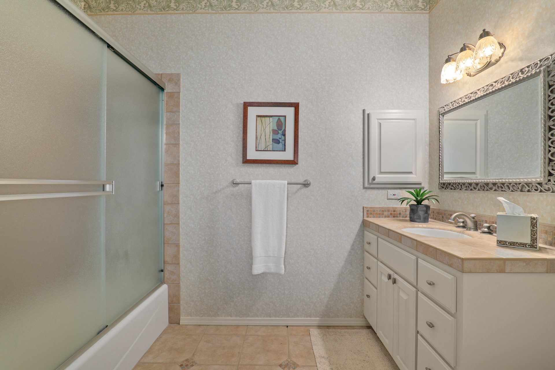The kitchen was designed for both form and function, offering granite countertops, a large center island, walk-in pantry, and a separate butler’s pantry with sink — perfect for entertaining. The layout flows seamlessly into the dining and living areas, as well as to an atrium-style courtyard at the center of the home. This private outdoor space features a tranquil water feature and built-in BBQ/outdoor kitchen, creating an ideal setting for morning coffee, evening gatherings, or quiet reflection.