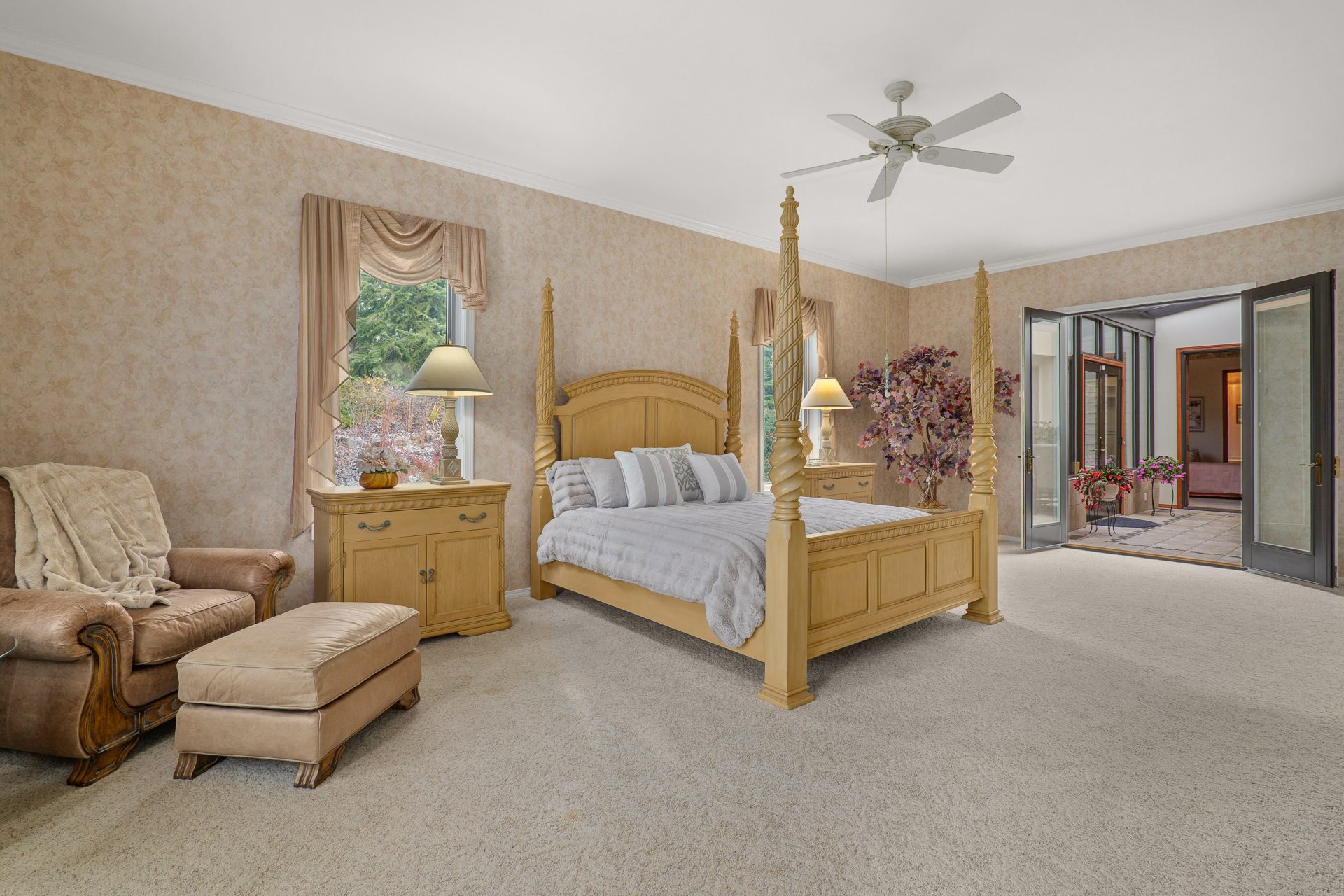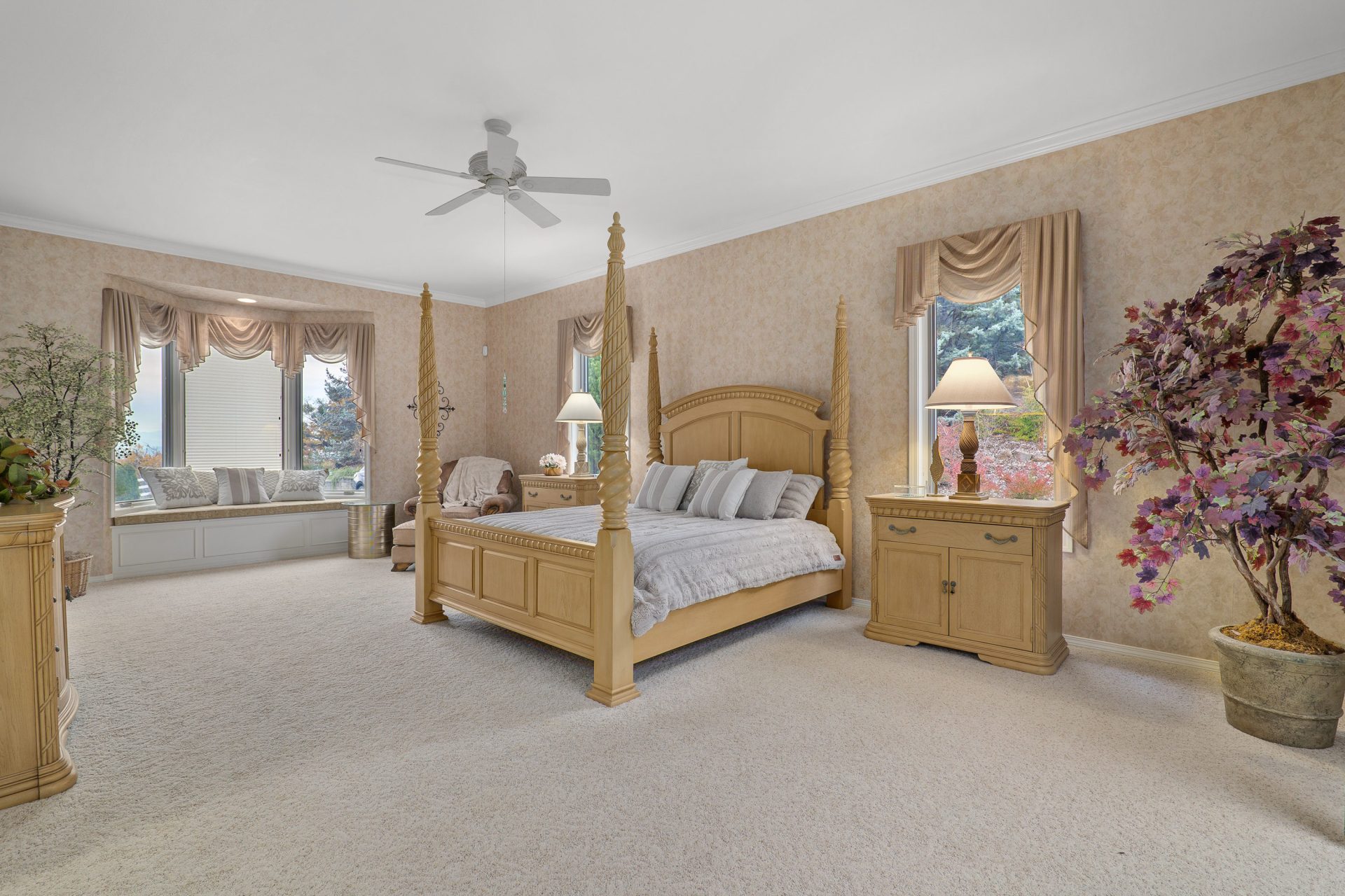 The home offers three primary suites (two on the main level) plus a private office and fourth full bathroom, providing flexibility for guests or multi-generational living. Comfort is elevated by zoned heating and cooling, featuring both a furnace and dual heat pumps with individual room control. Additional thoughtful amenities include an elevator connecting the main living level to the lower-level finished garage, a propane backup generator, and a fully automated sprinkler system that adjusts to rainfall.