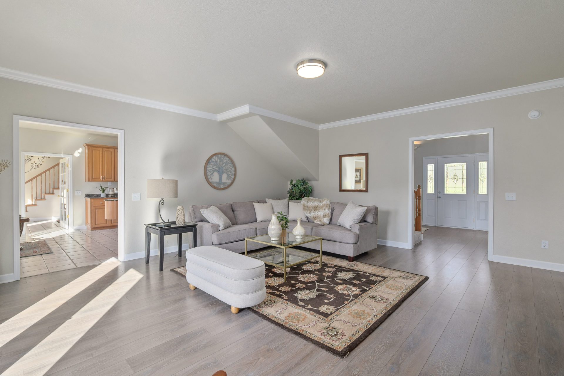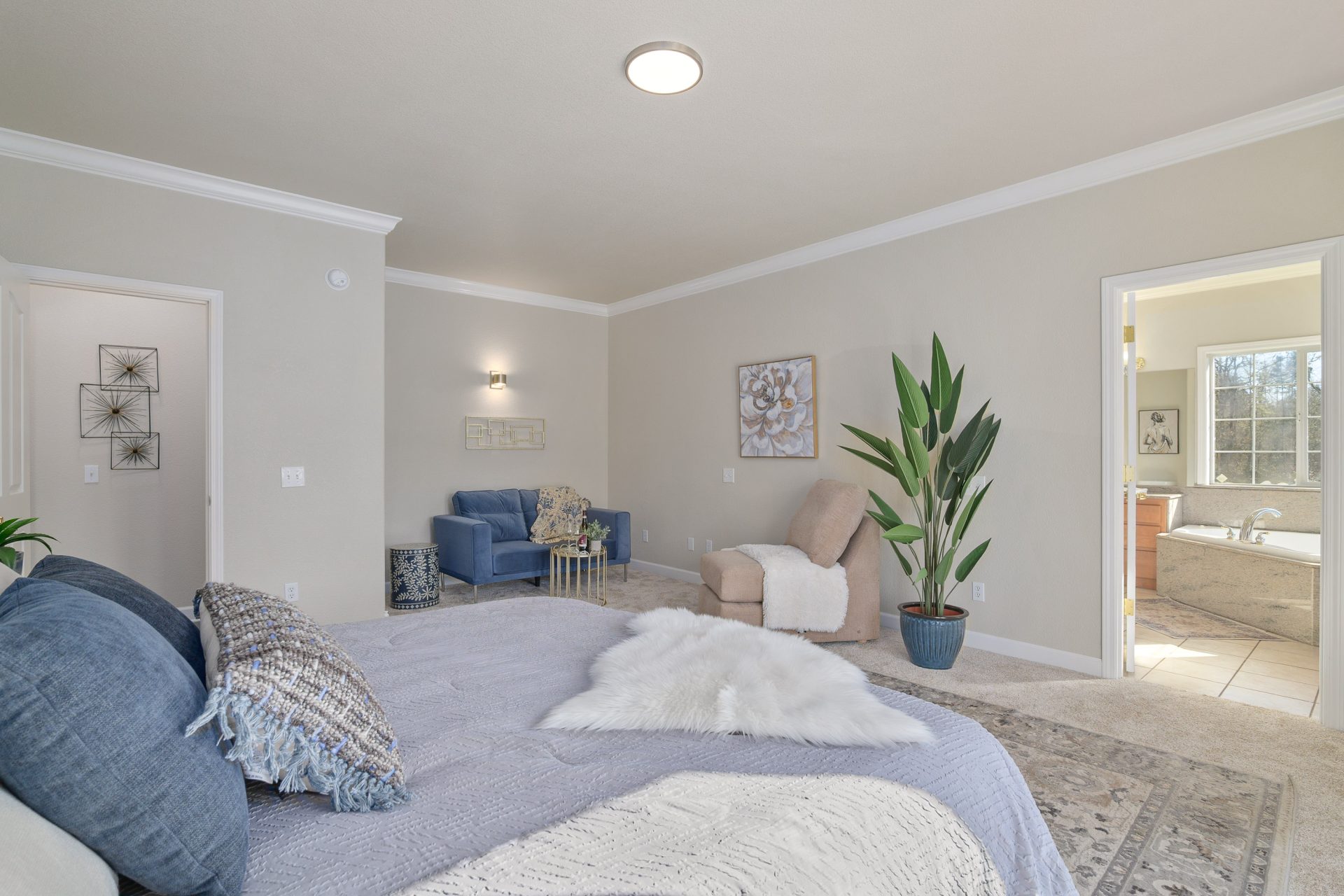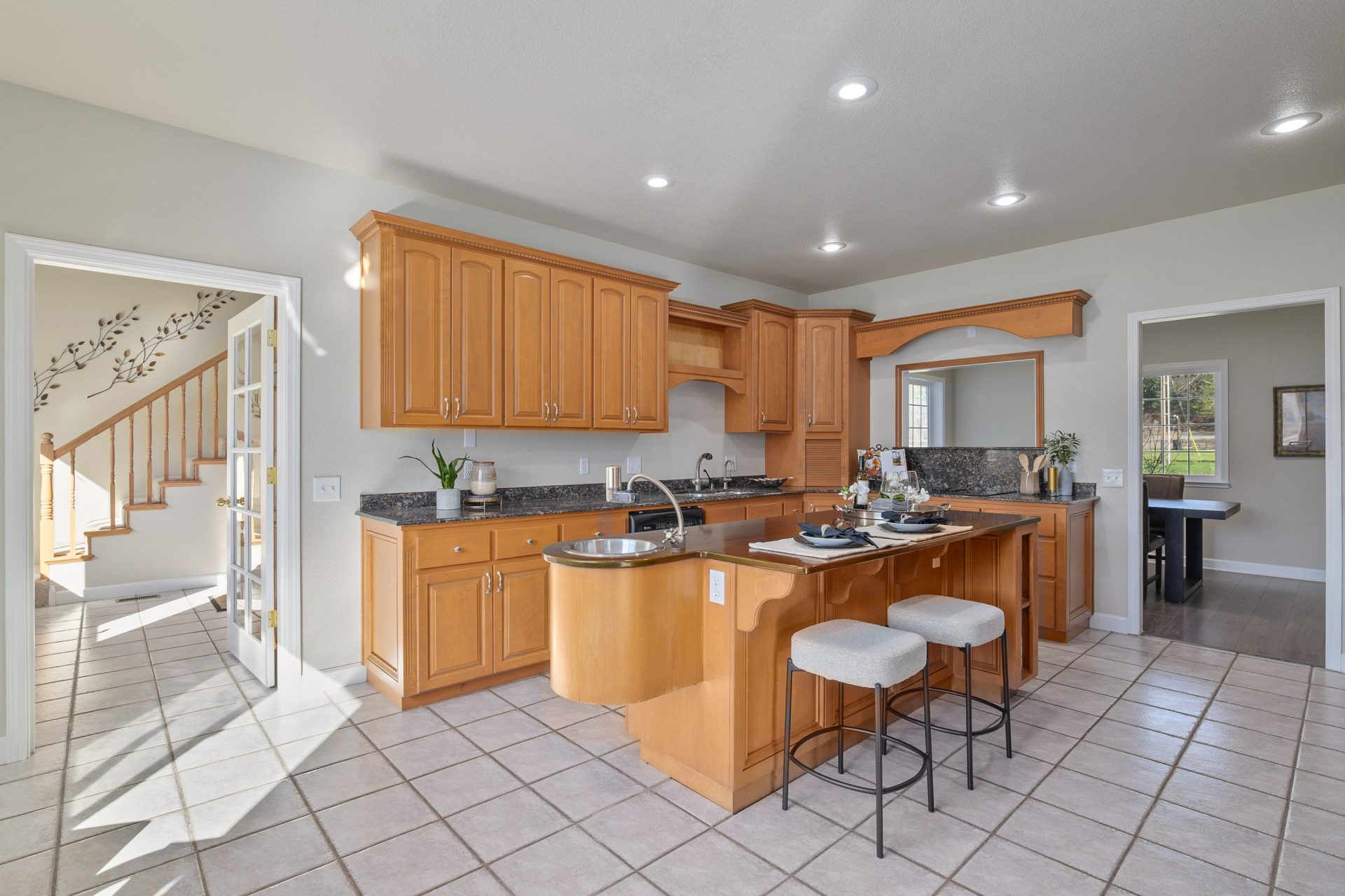 The two-story farmhouse features a traditional layout with clearly defined spaces. A grand foyer with tall vaulted ceilings opens to the loft above, creating a strong sense of arrival. The main level includes a formal living room, well-appointed kitchen, dedicated dining room, large private office, and a spacious primary suite. The kitchen is equipped with granite countertops, a large island, ample cabinetry, and dual ovens. The primary suite is located on the main level and offers a private retreat with an oversized bedroom, walk-in closet, and ensuite bath featuring dual vanities and a large jetted tub. An oversized utility room anchors the opposite wing of the home and is paired with a full guest bath. Access to the attached two-car garage is also located on this side of the home, making it ideal for ranch and outdoor living.