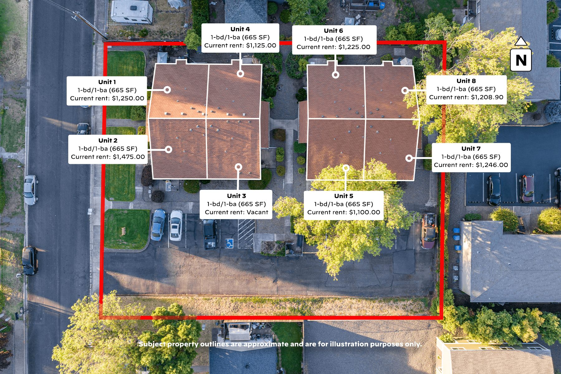 This well-maintained property consists of two single-level fourplexes, offering (8) 655 SF, 1-bed / 1-bath units, with most units with long-term, senior tenants. Each unit enjoys a convenient and efficient floorplan, with each ‘feeling’ much larger than the stated square footage. The large entry and living rooms lead to a dining area, full-sized kitchen, storage, full bathroom and spacious bedroom, as well as including in-unit washer and dryer hookups. All units also enjoy a private patio, providing outdoor space for each tenant.