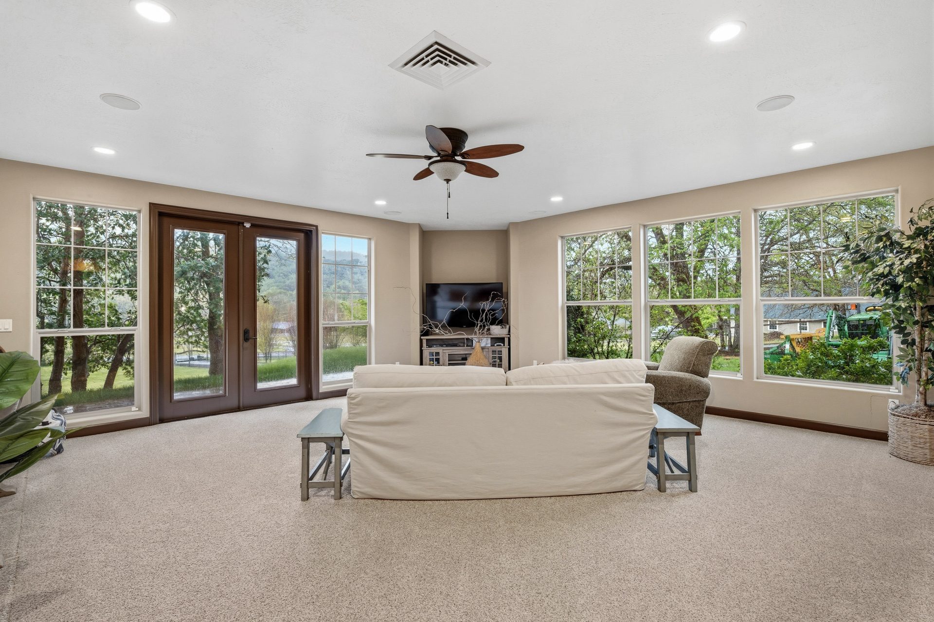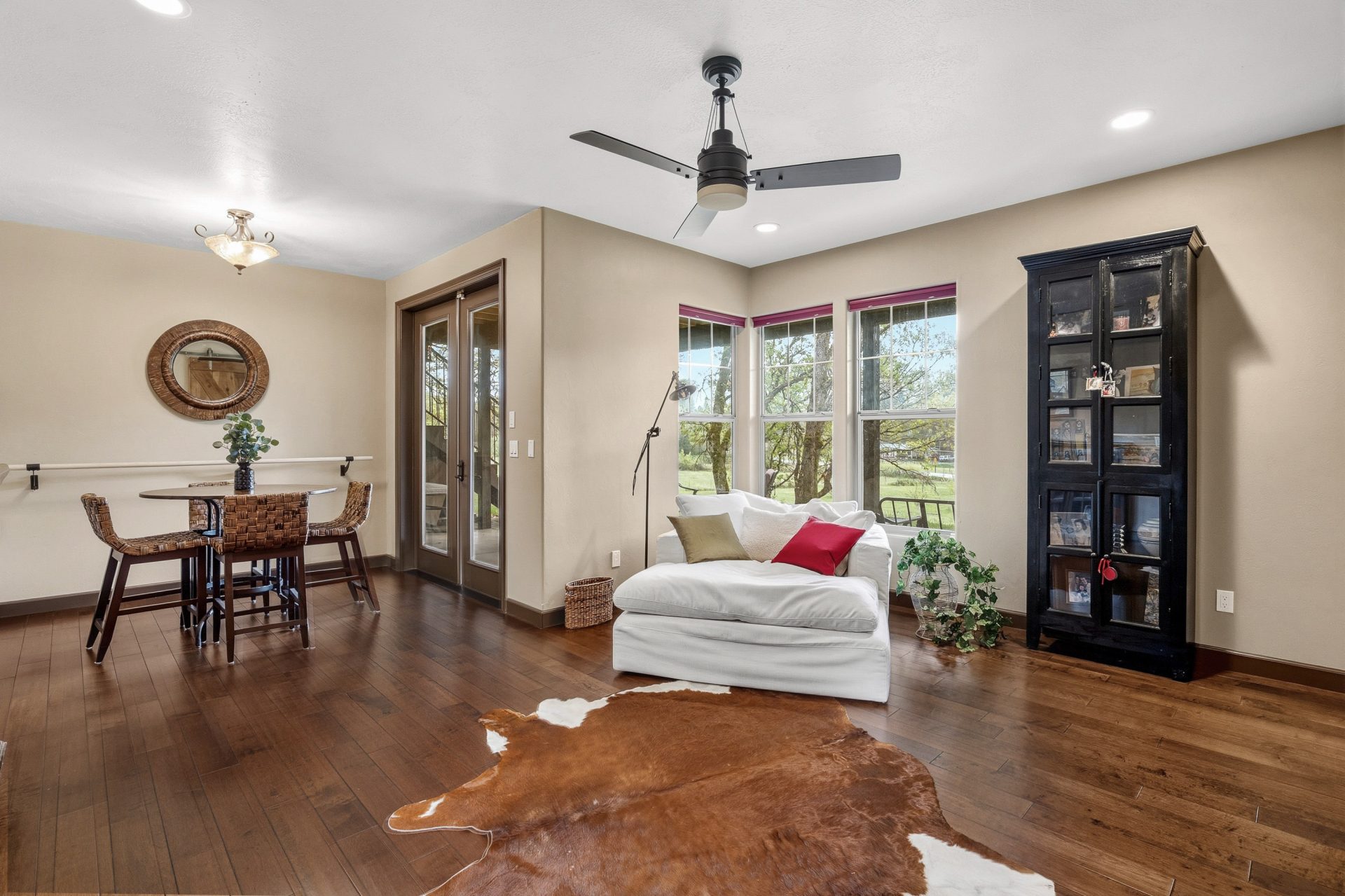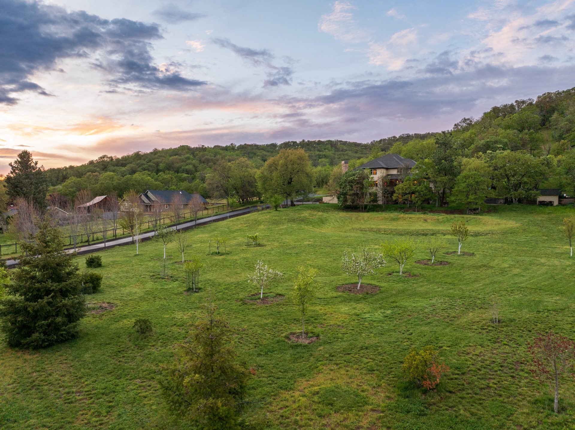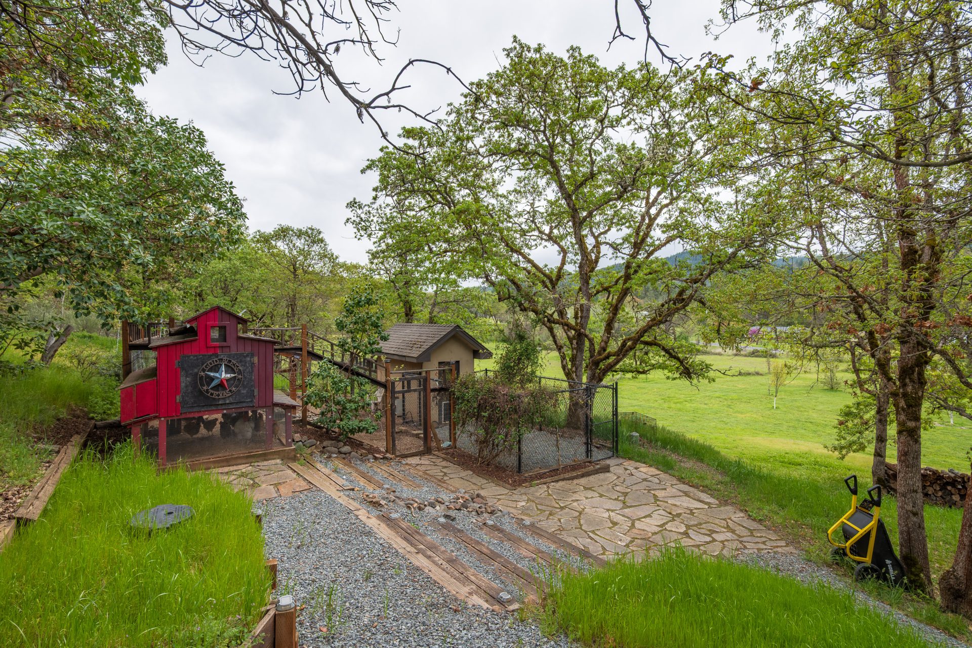 The 5.81 acre setting is both usable and visually appealing, with gently rolling topography that enhances privacy while maintaining functionality. A blend of open pasture and wooded areas creates a dynamic landscape, complemented by 18 fruit trees, growing areas for berries, garden spaces, and a well appointed chicken coop with run. The result is a setting that feels both refined and grounded in Southern Oregon lifestyle.