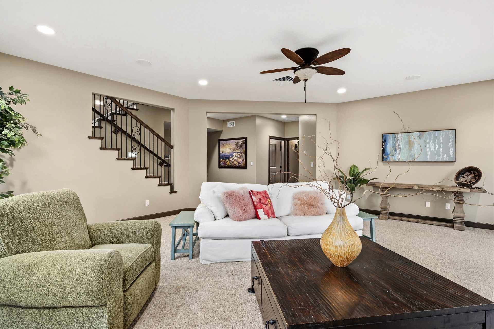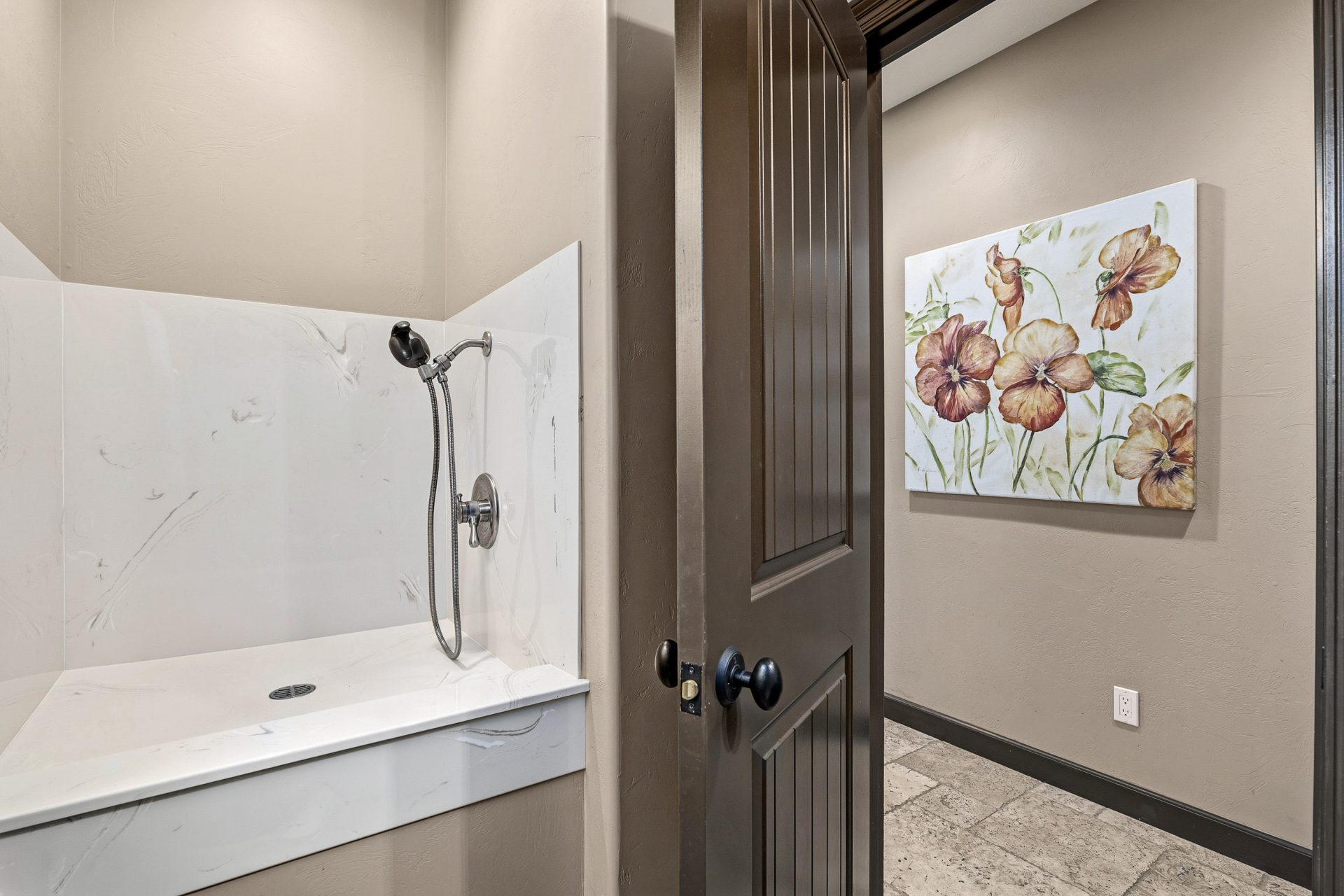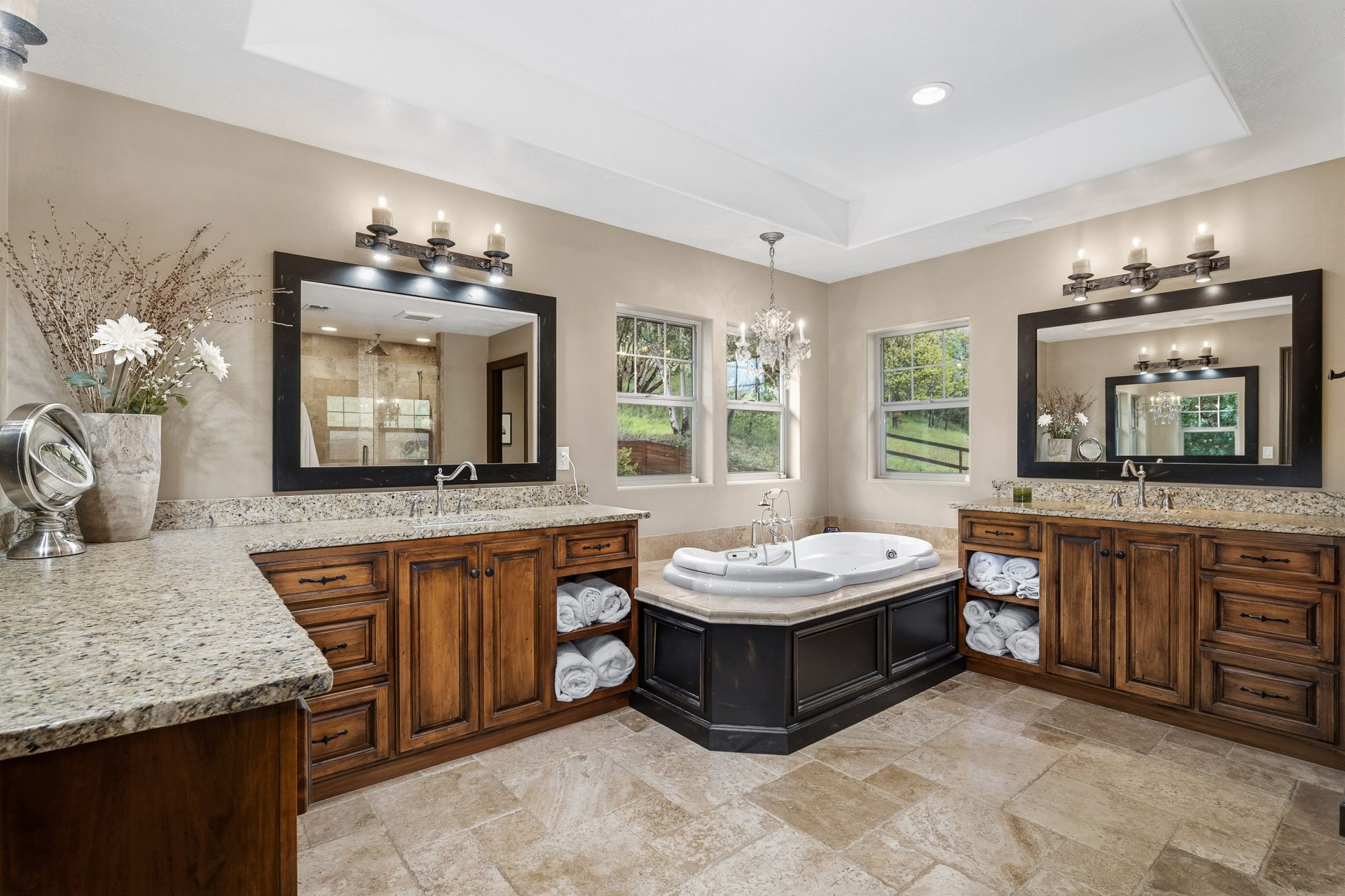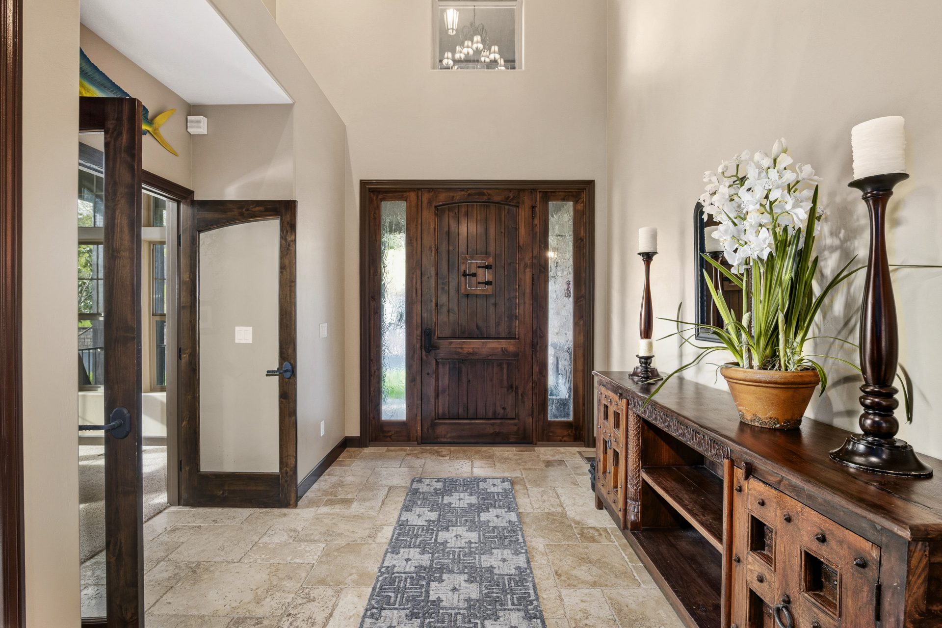 The approach is both inviting and impressive, beginning with a paved drive that leads through a custom automatic gate and opens to a residence defined by clean stucco lines, natural stone accents, and thoughtfully designed hardscape. Covered outdoor living areas, stamped concrete patios, and layered elevations create depth and dimension, setting the tone for what lies within. A travertine entry introduces the home with a sense of quality and permanence that continues throughout.