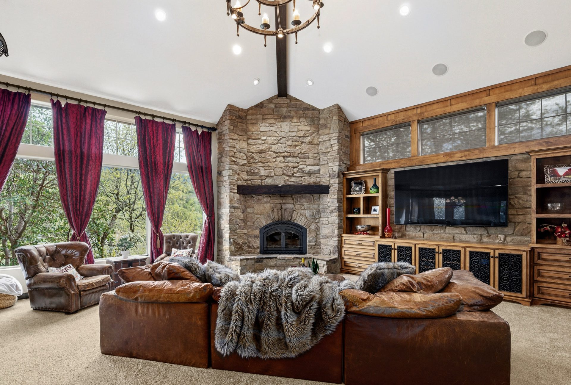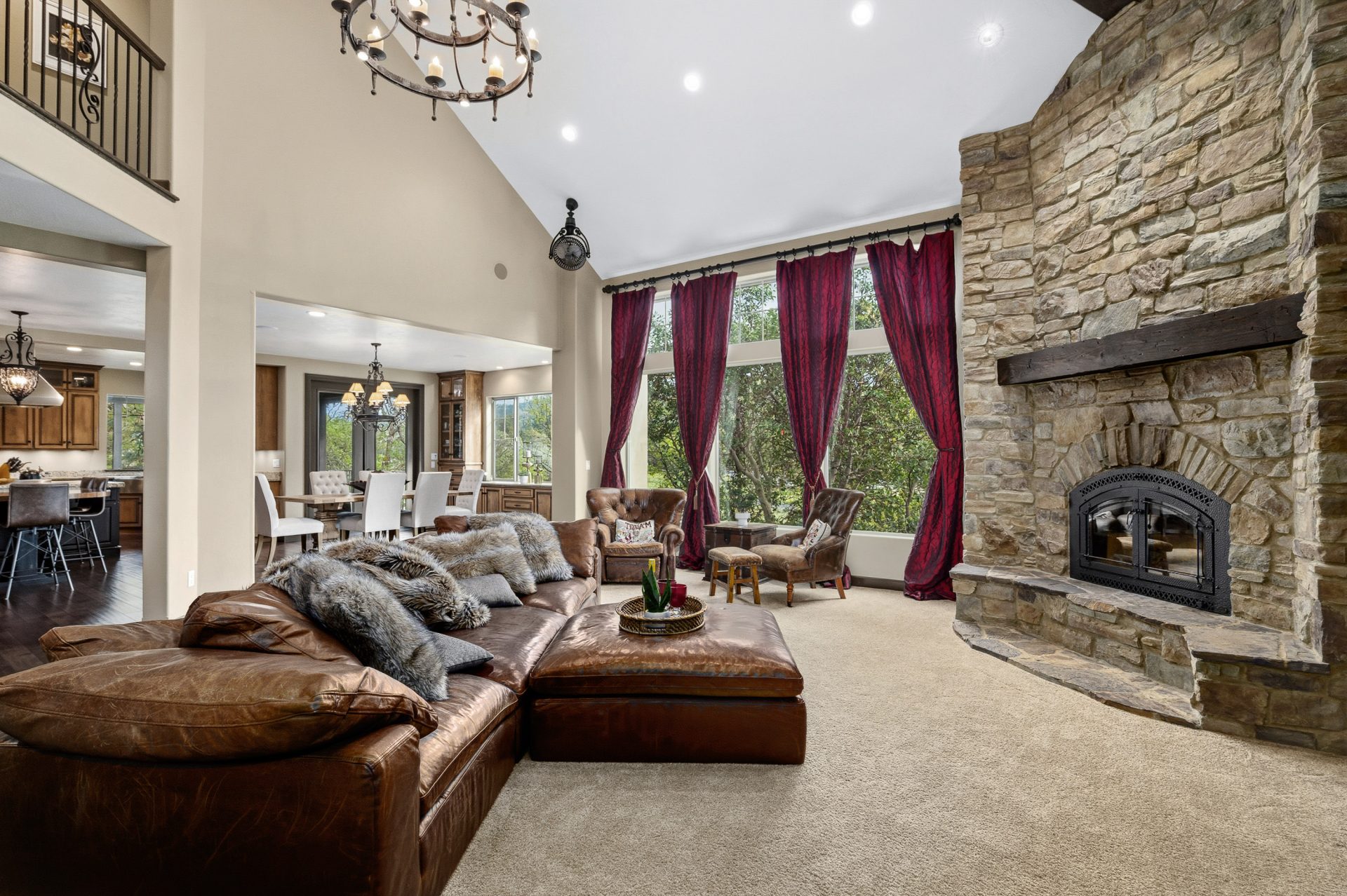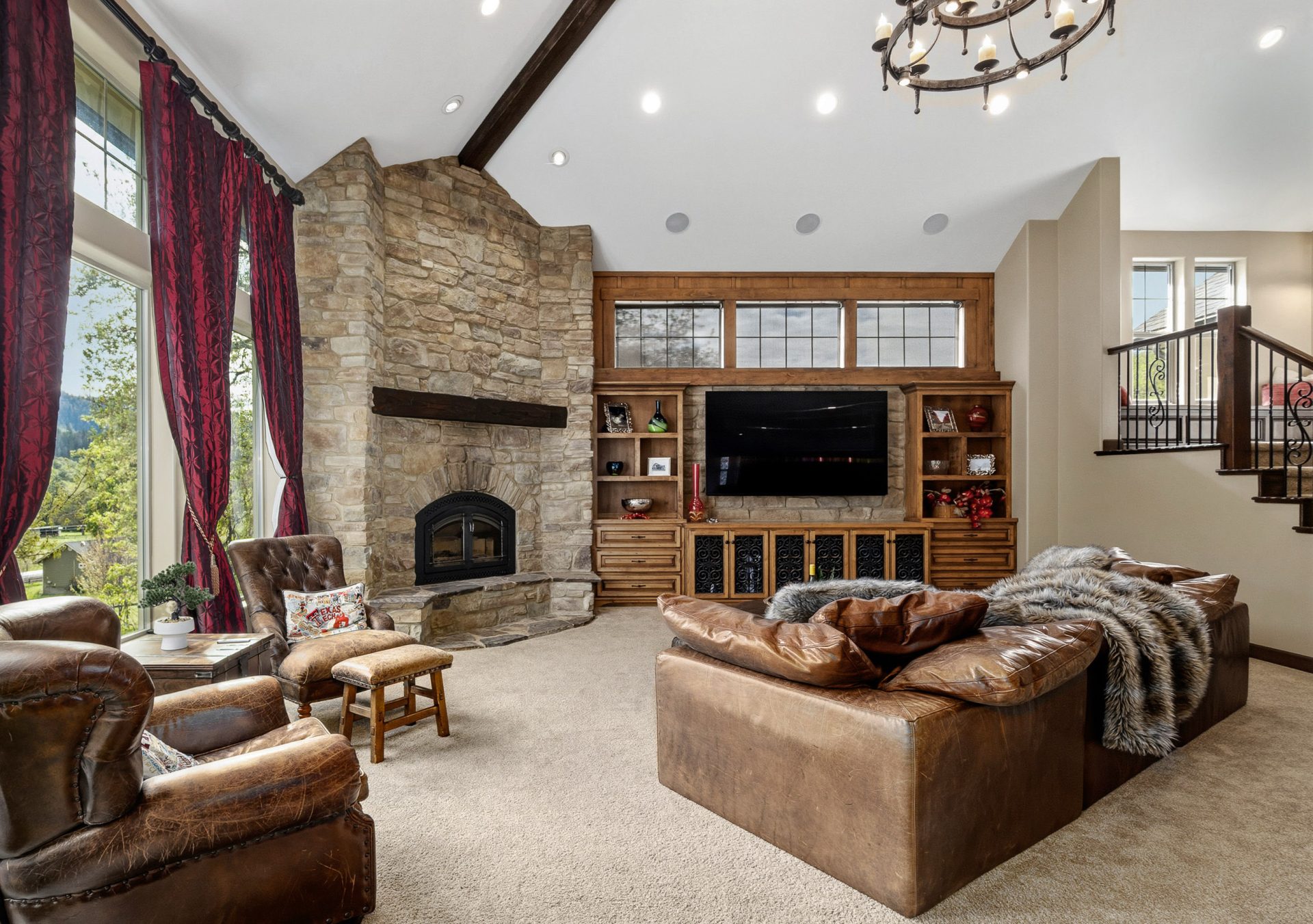 The main level is designed as the heart of the home, balancing everyday comfort with impressive entertaining spaces. Inside, the residence opens into a grand great room where soaring vaulted ceilings, custom built-ins, and striking rock accents create a warm yet sophisticated focal point. Natural light and scale define the space, while the flow between living, dining, and kitchen areas supports both intimate living and larger gatherings. A wet bar with black walnut countertops adds another layer of refinement and function.