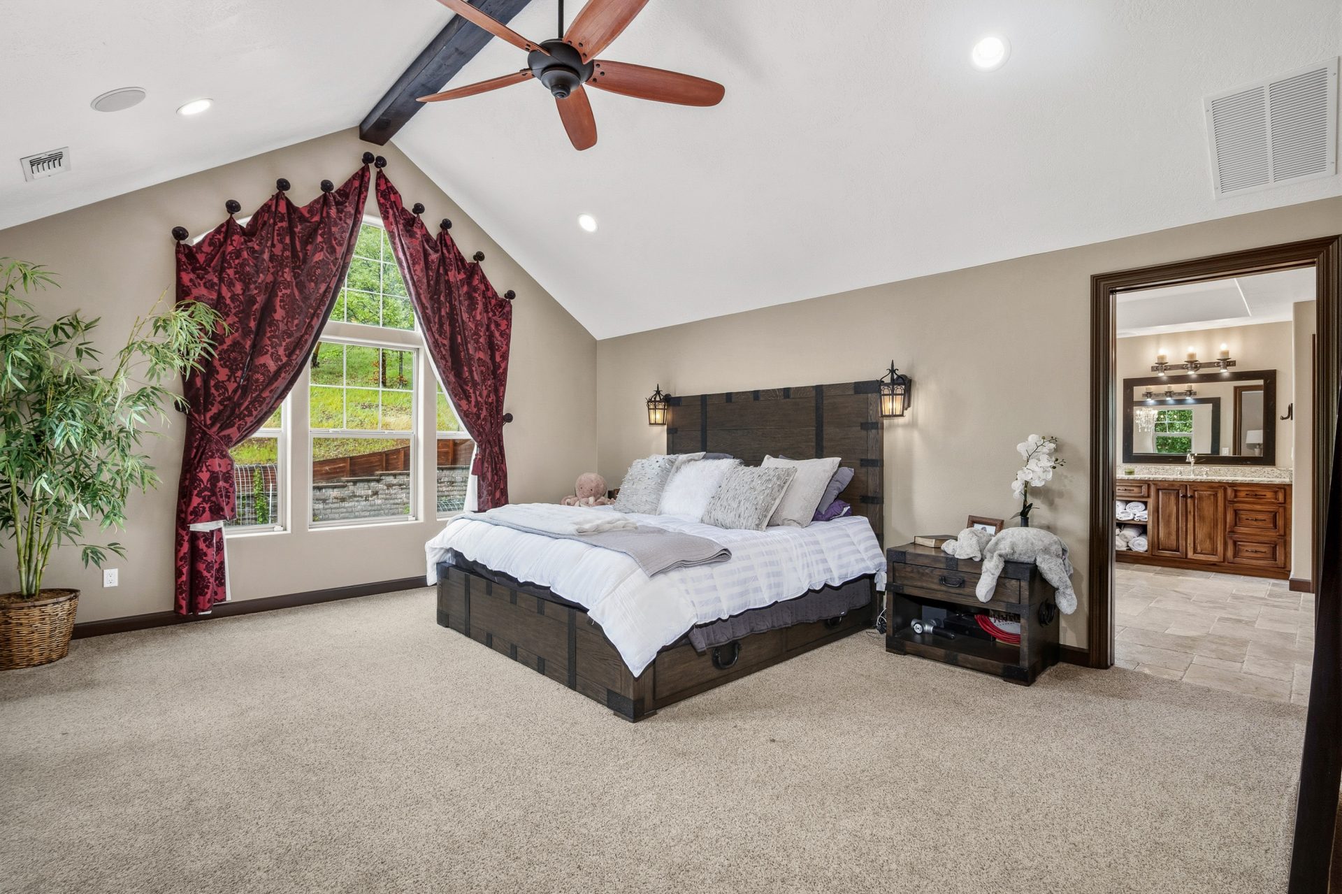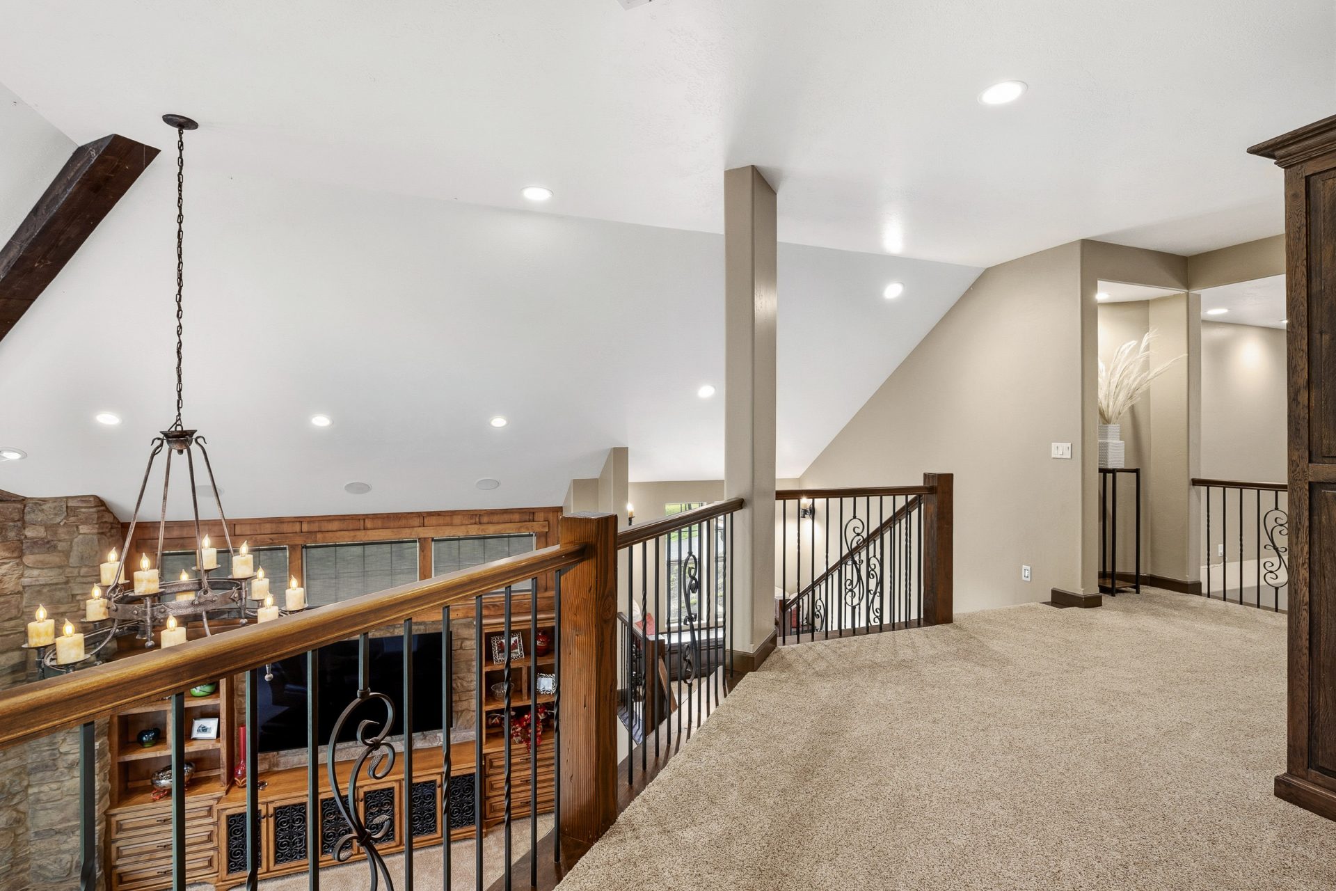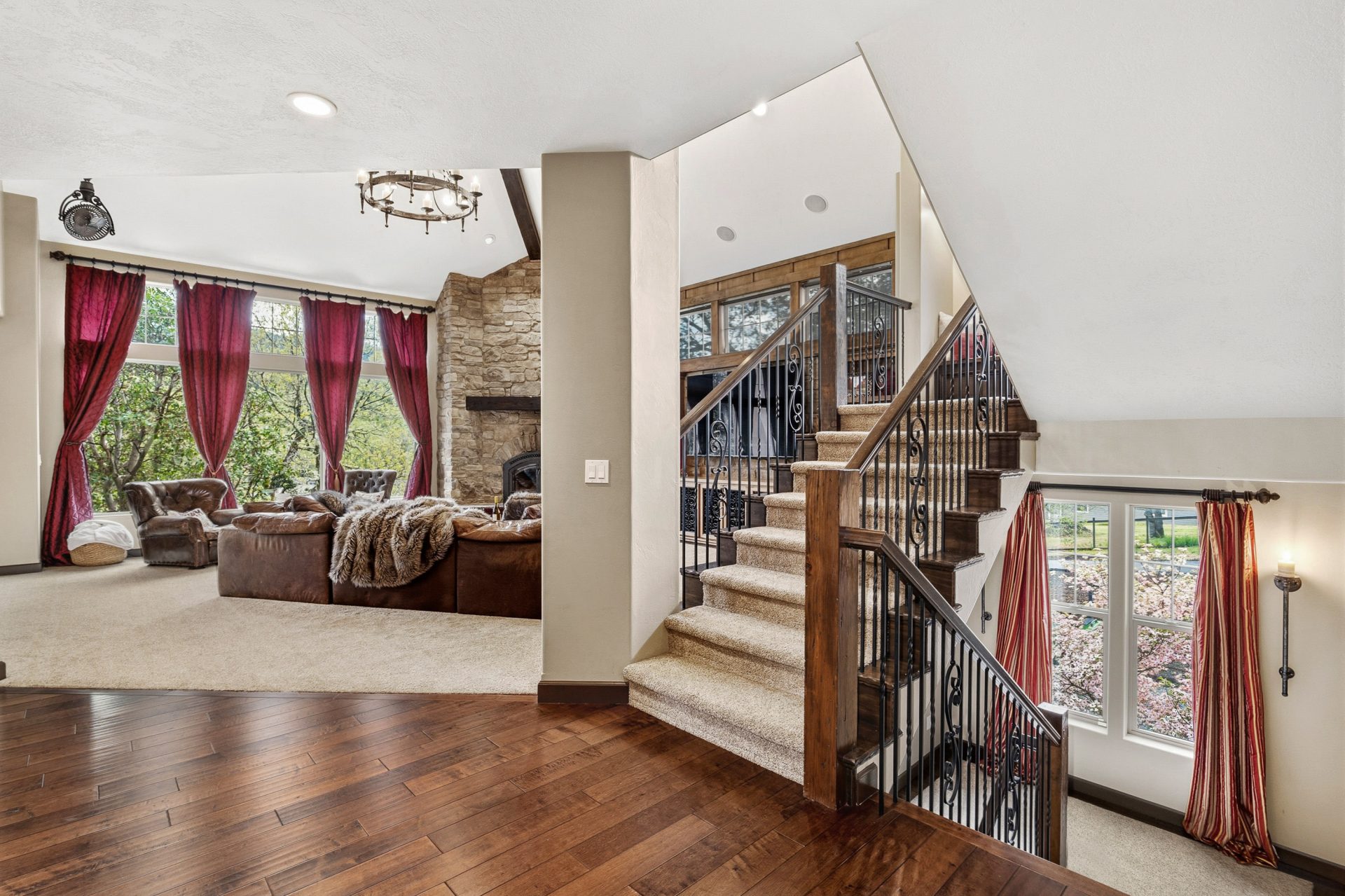 The main level is designed as the heart of the home, balancing everyday comfort with impressive entertaining spaces. Inside, the residence opens into a grand great room where soaring vaulted ceilings, custom built-ins, and striking rock accents create a warm yet sophisticated focal point. Natural light and scale define the space, while the flow between living, dining, and kitchen areas supports both intimate living and larger gatherings. A wet bar with black walnut countertops adds another layer of refinement and function.
