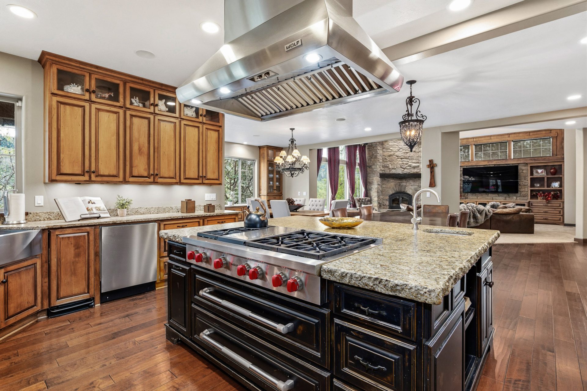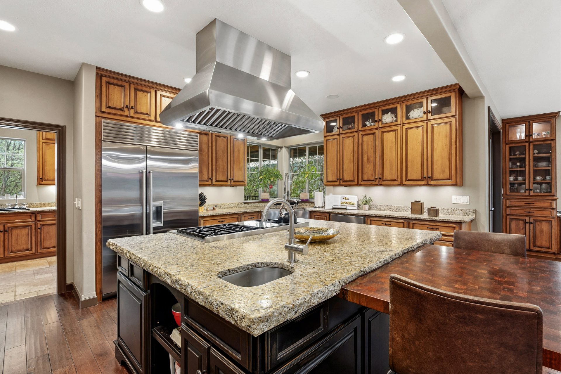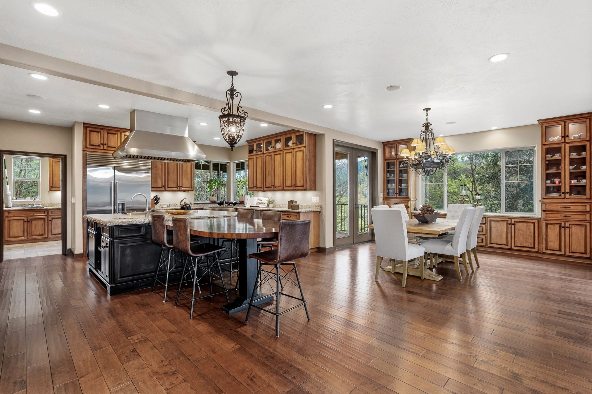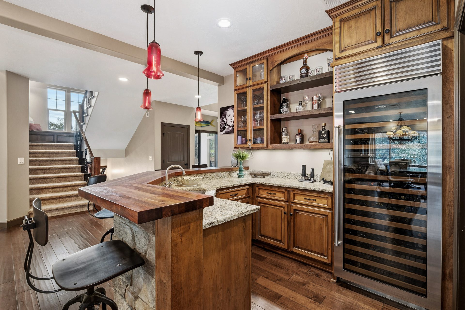 The kitchen is both a statement and a workspace, crafted with custom alder cabinetry in a distressed wine finish, leathered granite surfaces with live edge detail, and a Green Mountain walnut butcher block that serves as both function and centerpiece. A professional grade appliance suite includes a Wolf six burner range with griddle, Sub Zero refrigeration, Miele dishwasher, and KitchenAid double convection ovens. A full size Sub Zero wine refrigerator adds a collector’s touch, while a spacious walk in pantry with solid wood shelving enhances everyday practicality. Direct access to the covered deck extends the kitchen outdoors for effortless entertaining.