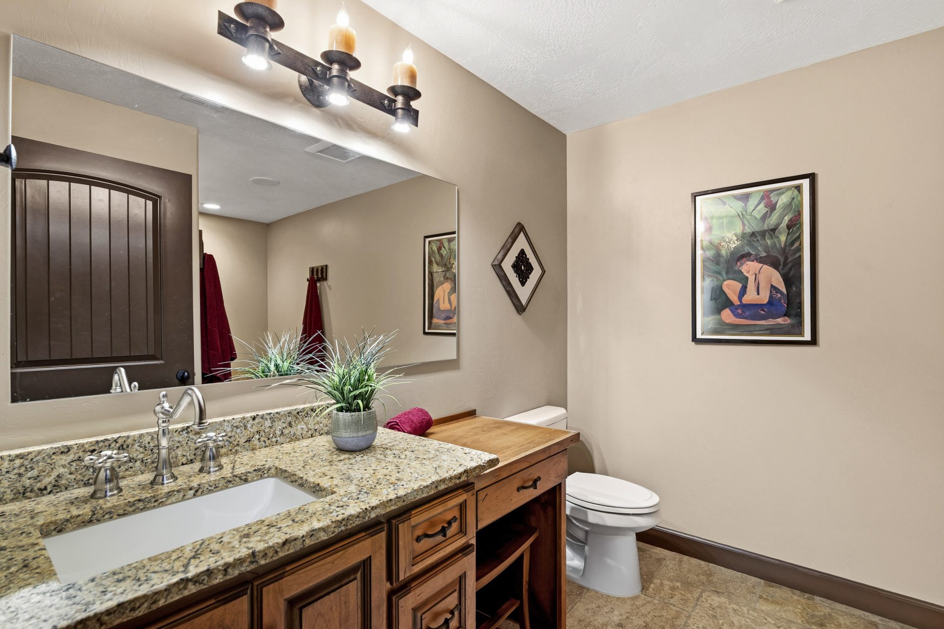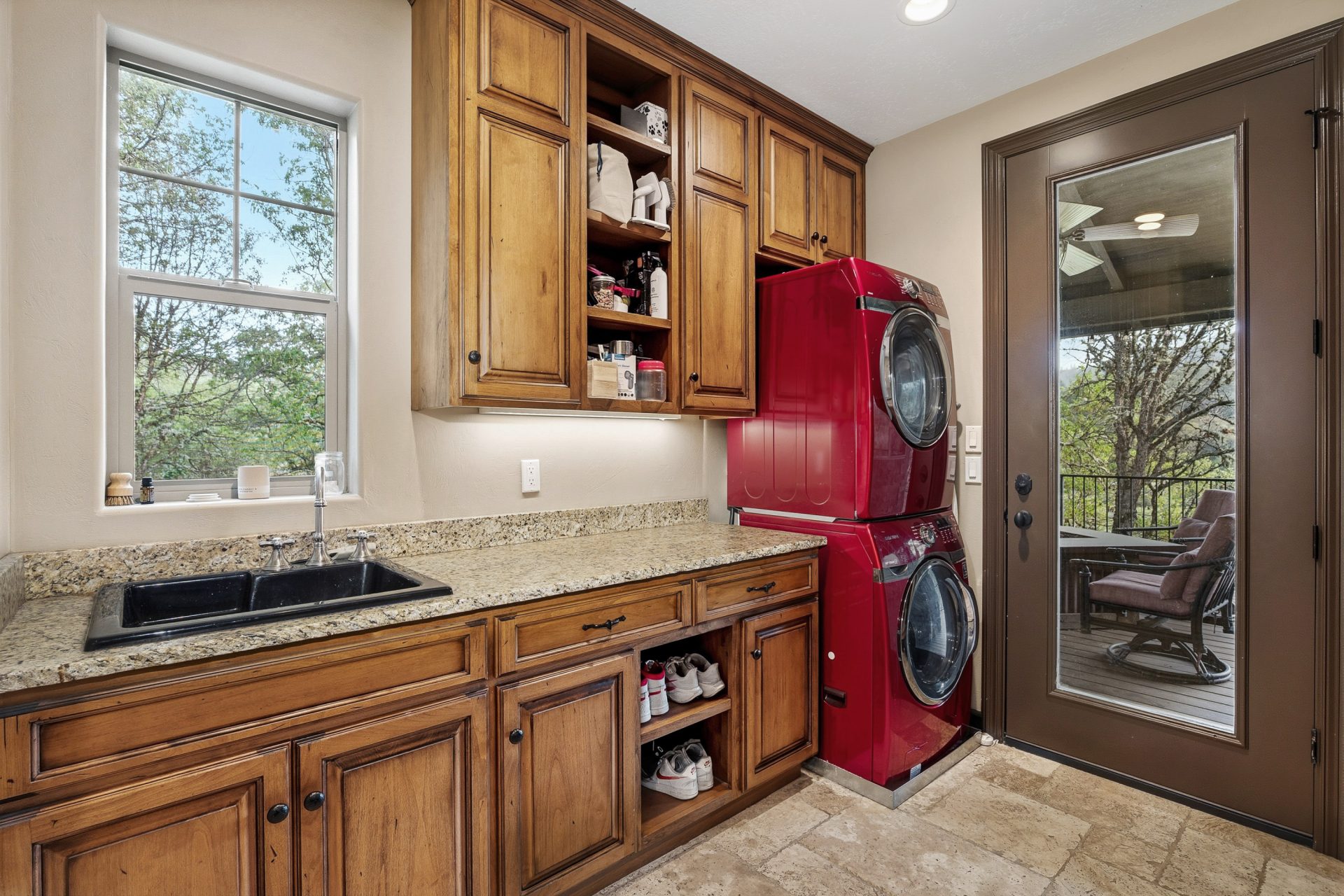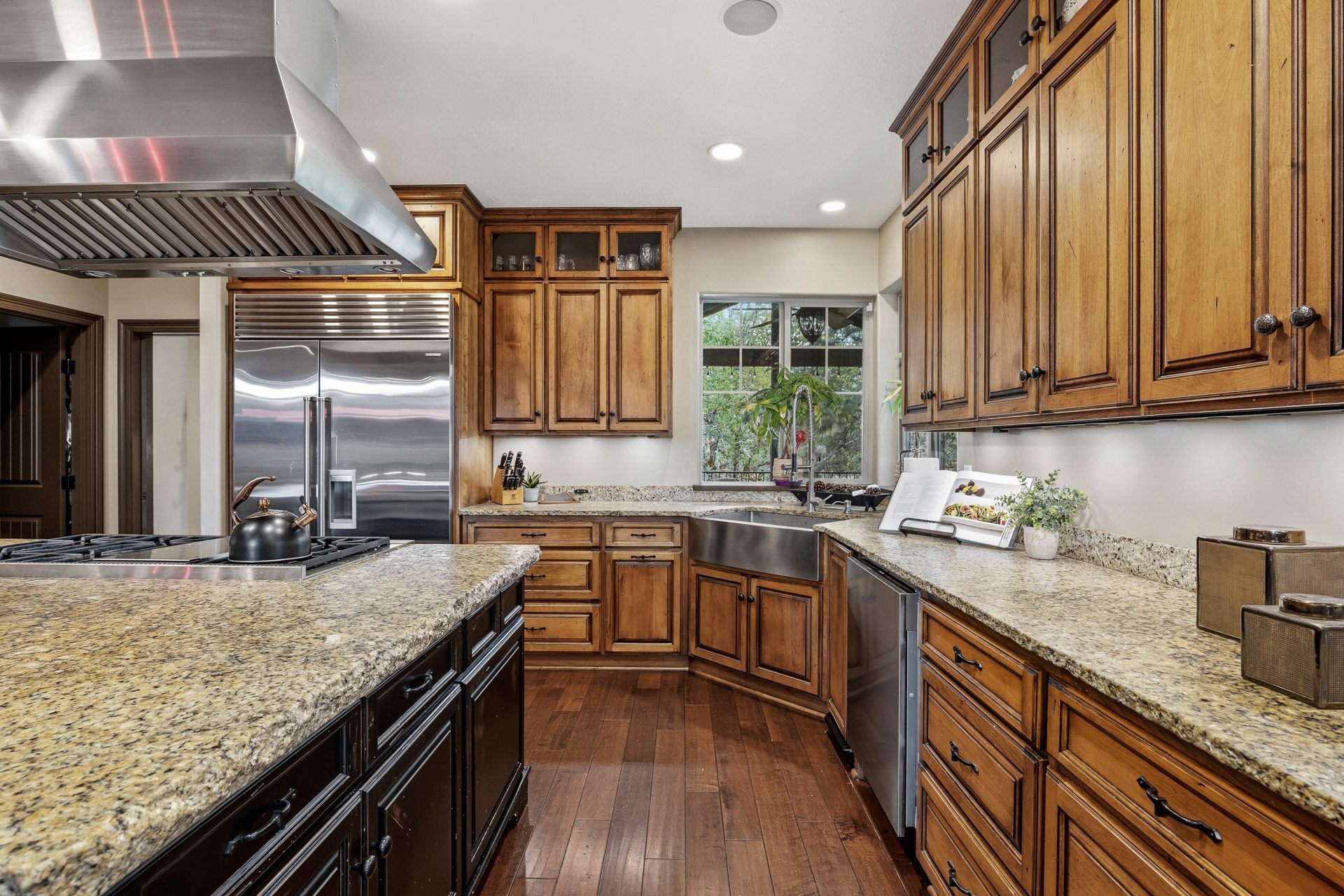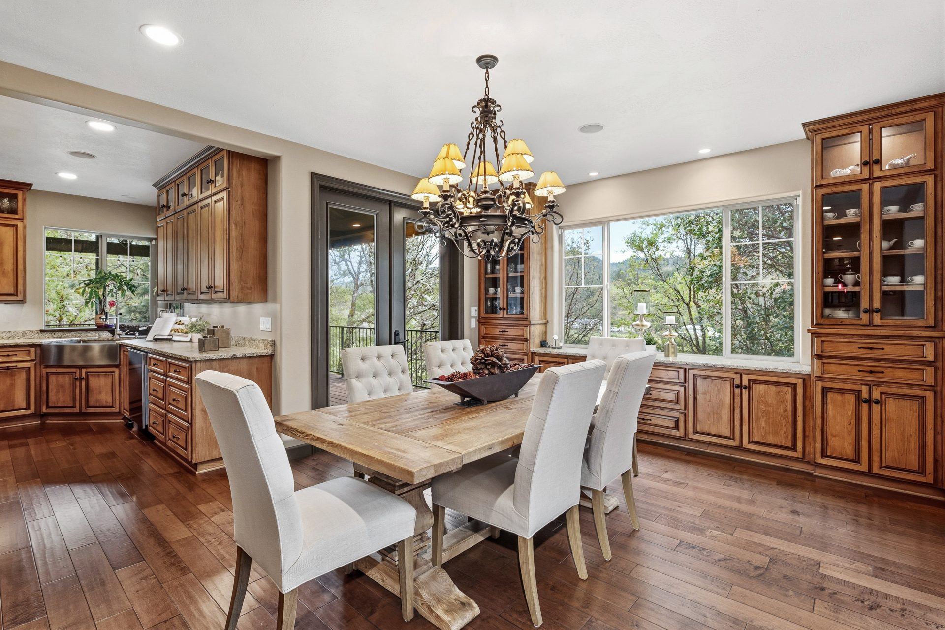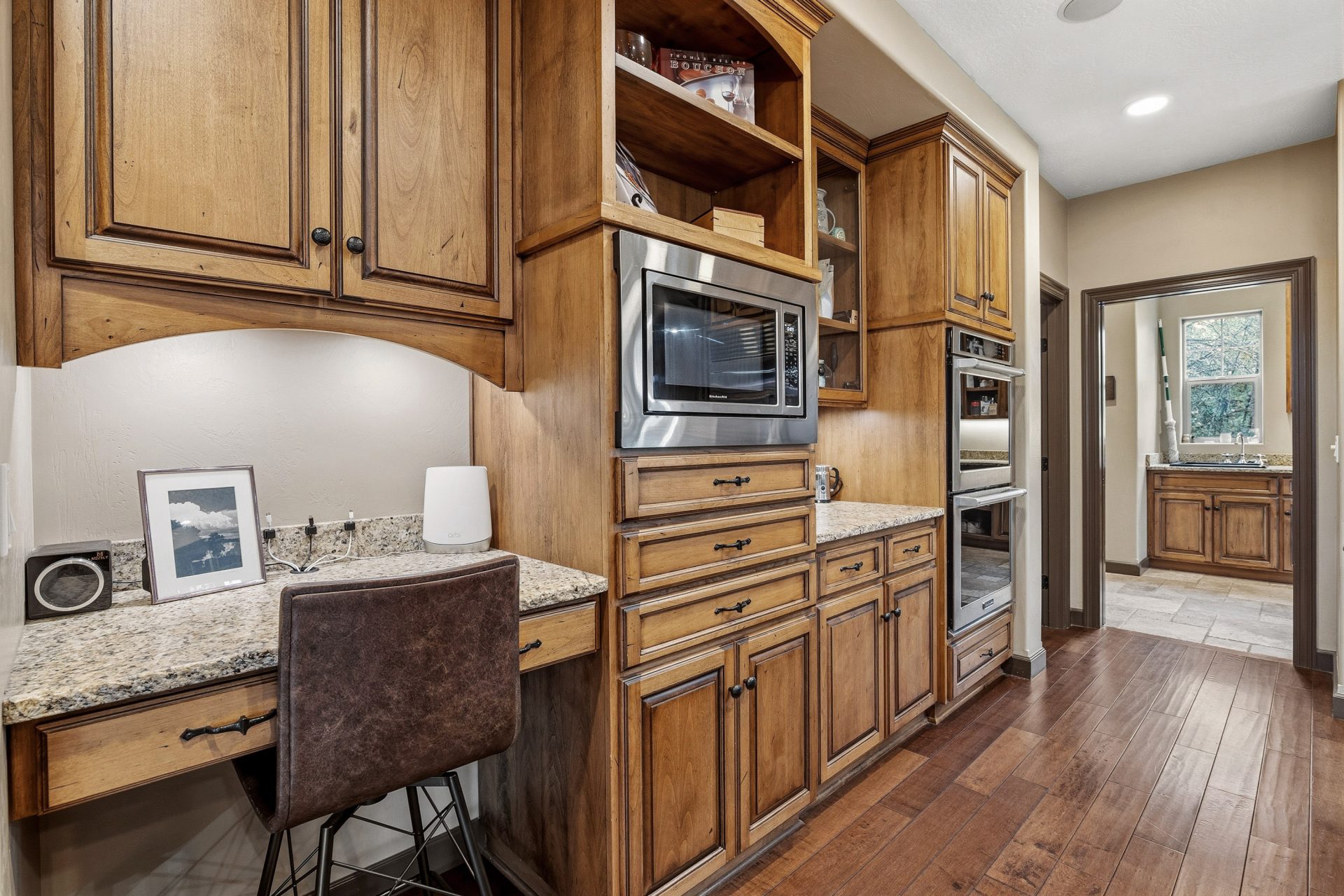 The kitchen is both a statement and a workspace, crafted with custom alder cabinetry in a distressed wine finish, leathered granite surfaces with live edge detail, and a Green Mountain walnut butcher block that serves as both function and centerpiece. A professional grade appliance suite includes a Wolf six burner range with griddle, Sub Zero refrigeration, Miele dishwasher, and KitchenAid double convection ovens. A full size Sub Zero wine refrigerator adds a collector’s touch, while a spacious walk in pantry with solid wood shelving enhances everyday practicality. Direct access to the covered deck extends the kitchen outdoors for effortless entertaining.