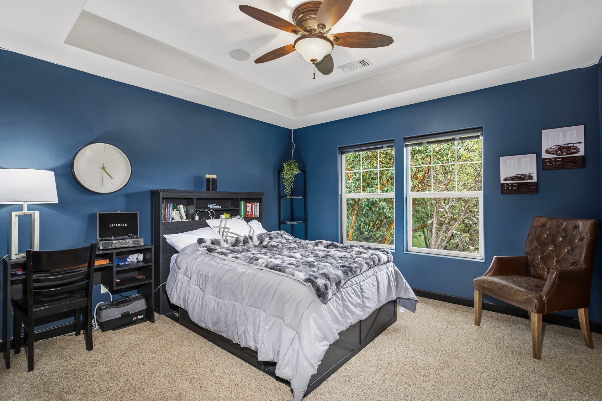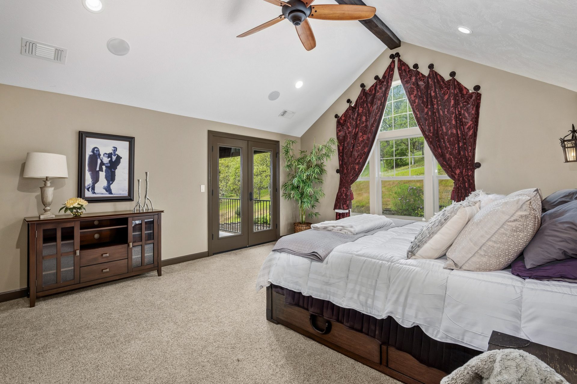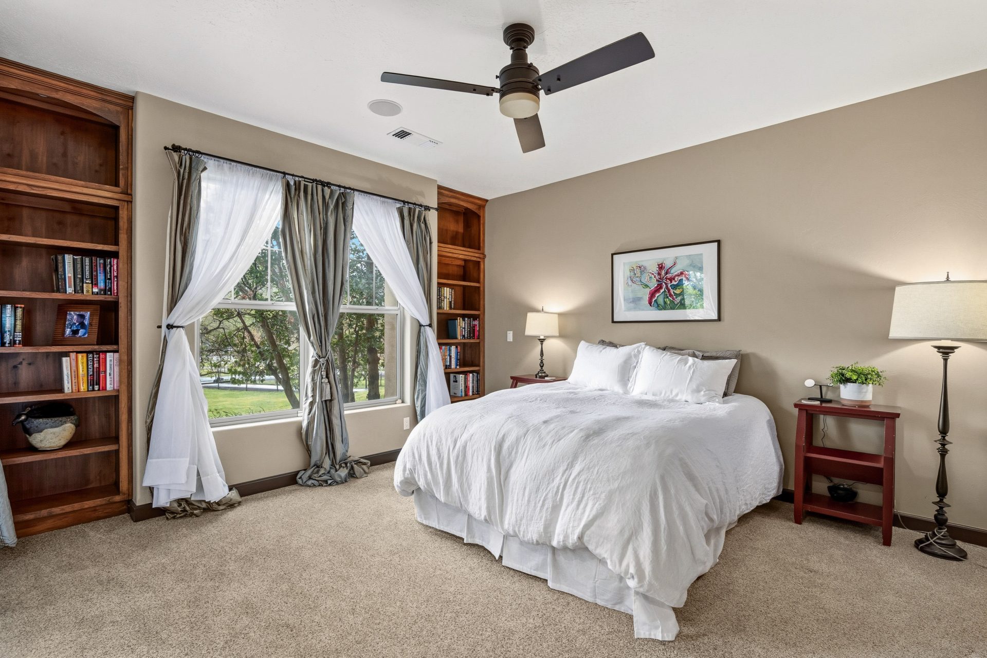 Designed to be experienced as much outside as in, the property offers multiple outdoor living spaces that mirror the quality and intention of the interior. Covered outdoor areas, stamped concrete patios, and tiered spaces create a natural flow for gathering and relaxation. A built in propane fire feature, BBQ connection, and expansive irrigated lawns enhance both ambiance and function.