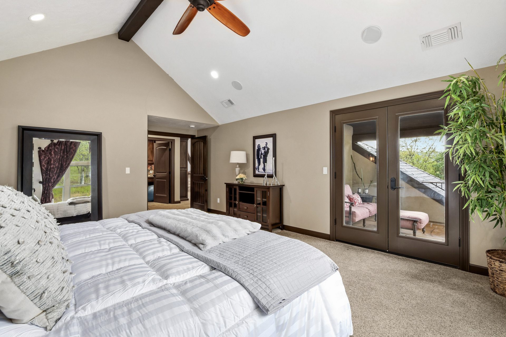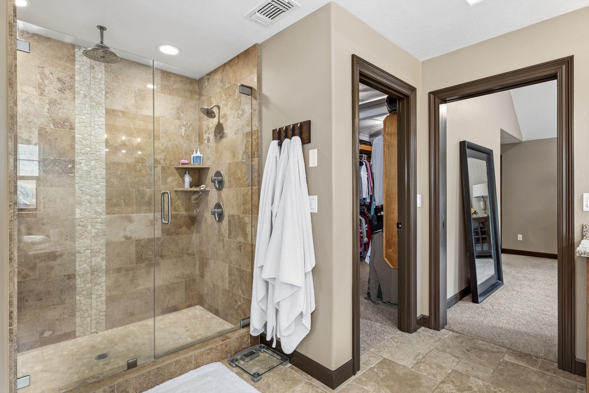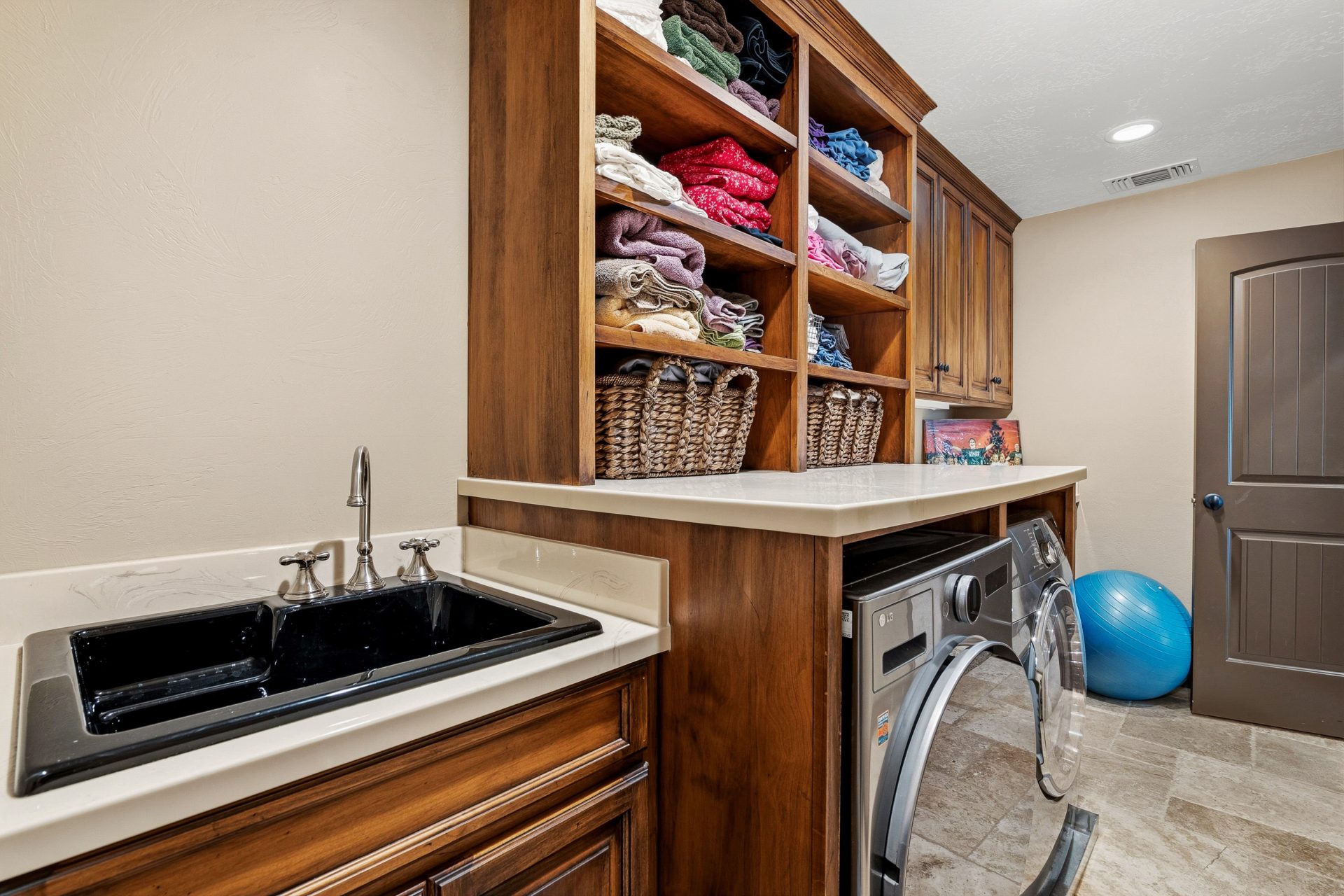 The upper level is devoted to private living space, anchored by a central loft that overlooks the great room below and enhances the home’s open, layered design. Four full bedrooms are located on this floor, each appointed with its own en suite bathroom, creating a rare sense of privacy and comfort throughout. The primary suite is positioned as a true retreat, featuring vaulted ceilings, a private balcony, walk-in closet, and a spa inspired bath with heated floors and a jetted tub. An upper level laundry area with a drying rack adds everyday convenience and reinforces the thoughtful livability of the floor plan.