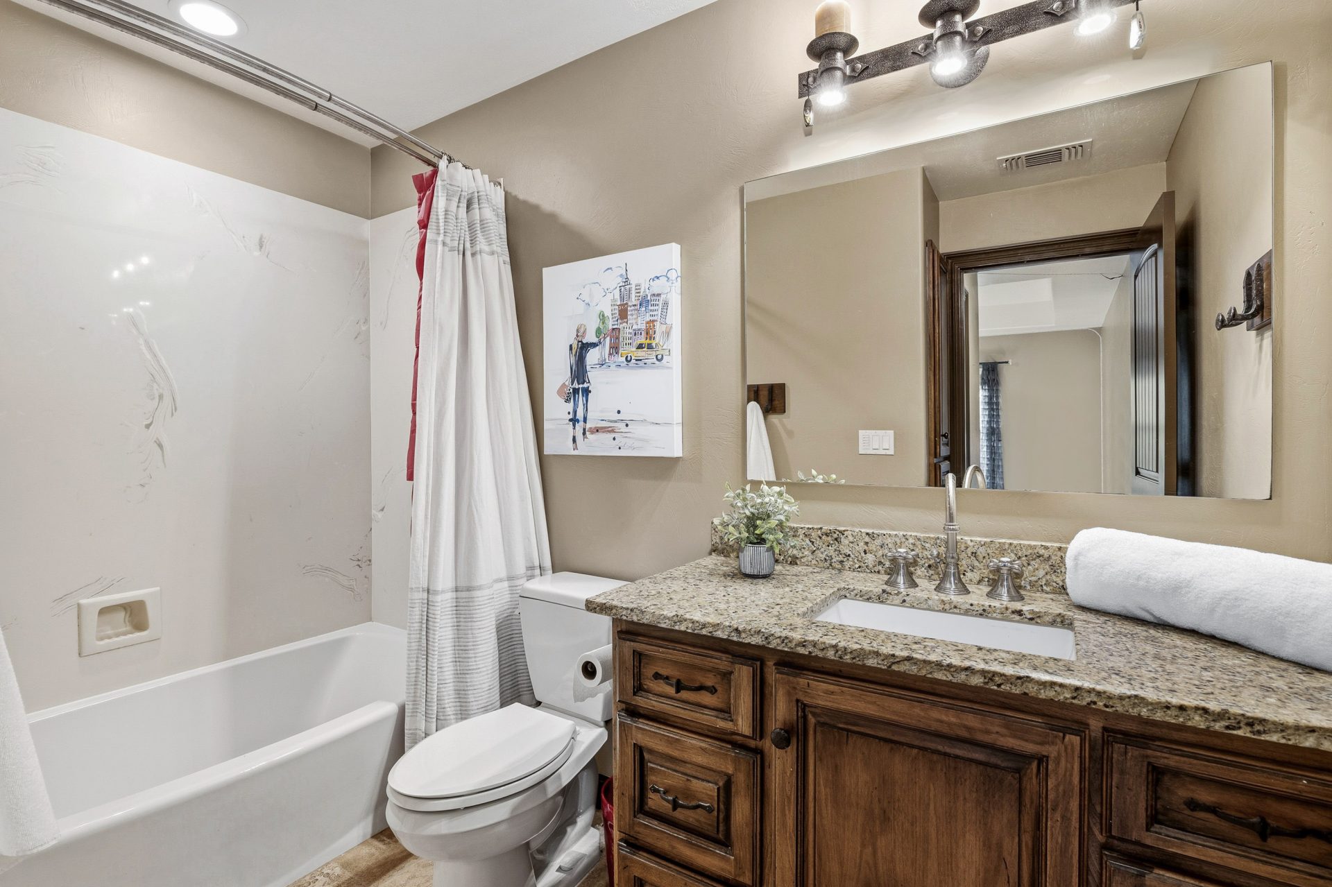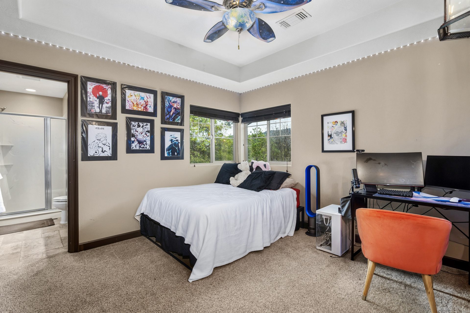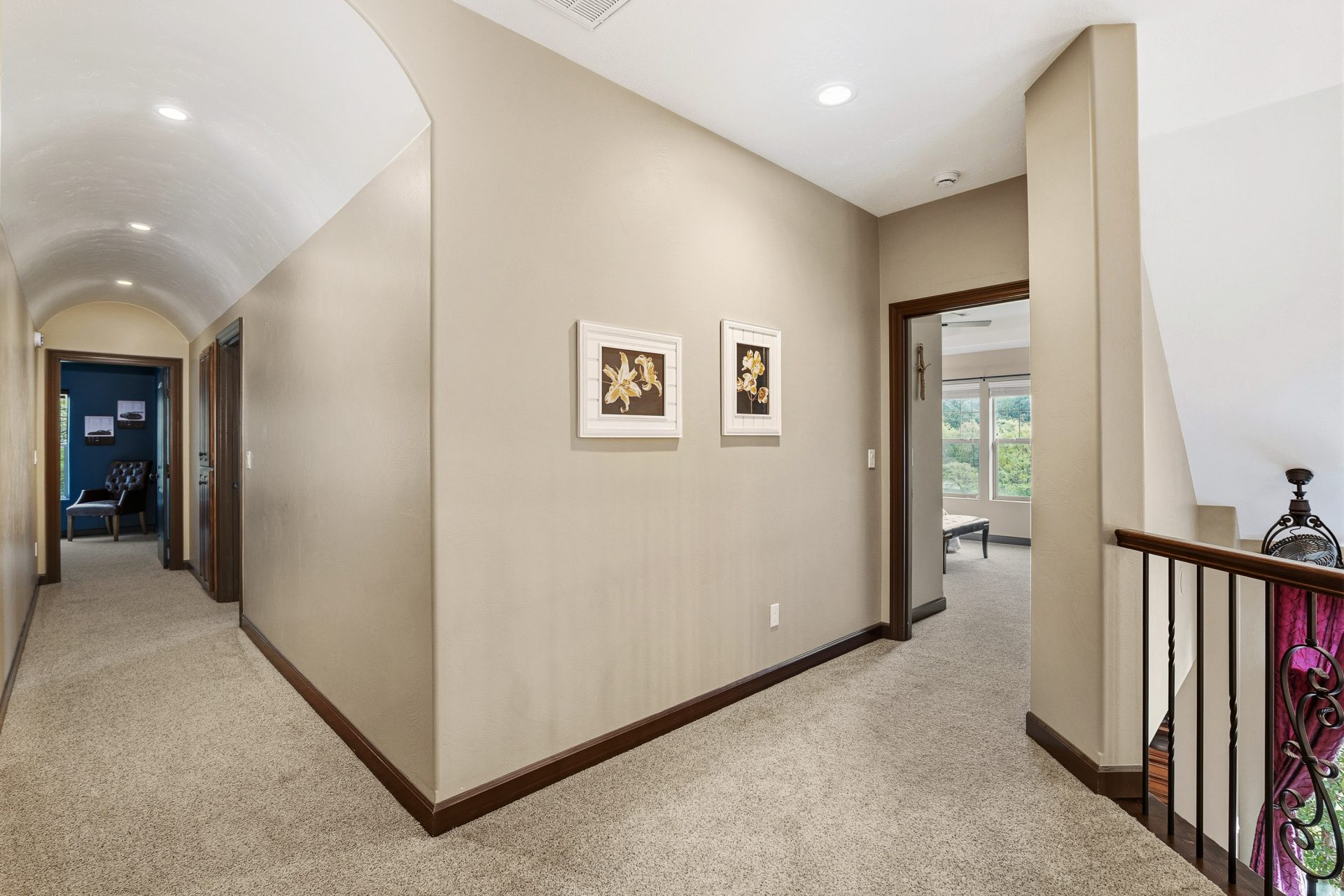 The upper level is devoted to private living space, anchored by a central loft that overlooks the great room below and enhances the home’s open, layered design. Four full bedrooms are located on this floor, each appointed with its own en suite bathroom, creating a rare sense of privacy and comfort throughout. The primary suite is positioned as a true retreat, featuring vaulted ceilings, a private balcony, walk-in closet, and a spa inspired bath with heated floors and a jetted tub. An upper level laundry area with a drying rack adds everyday convenience and reinforces the thoughtful livability of the floor plan.