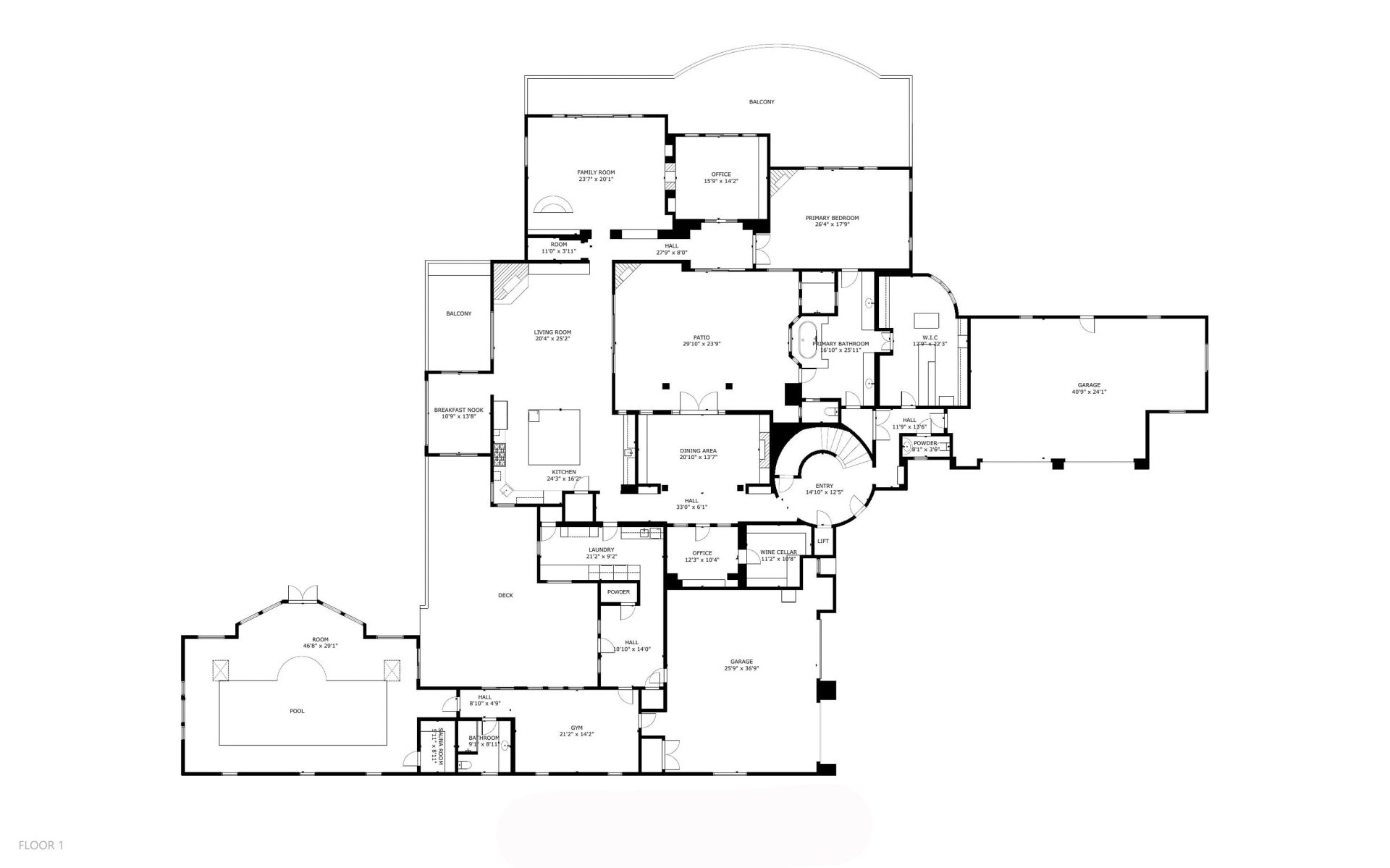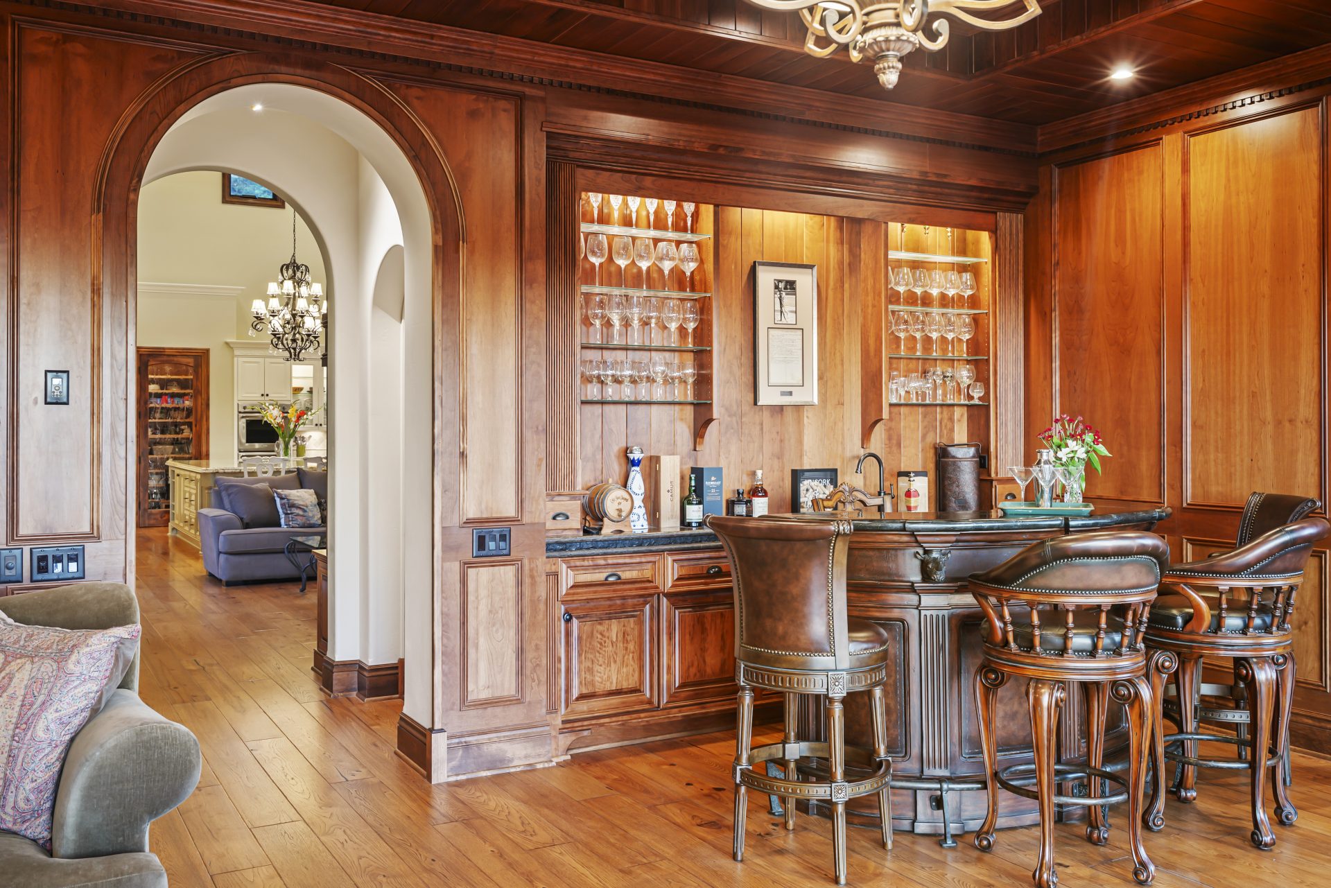 With a floor plan centered around the interior courtyard, the first space beyond the foyer is the formal dining room—an elegant setting with floor-to-ceiling windows, stately columns, and a custom fireplace with imported mantle. Across the hall, a climate-controlled 2,000-bottle wine room displays handcrafted shelving and warm wood detailing.