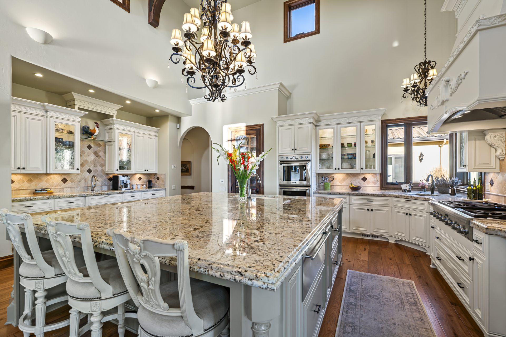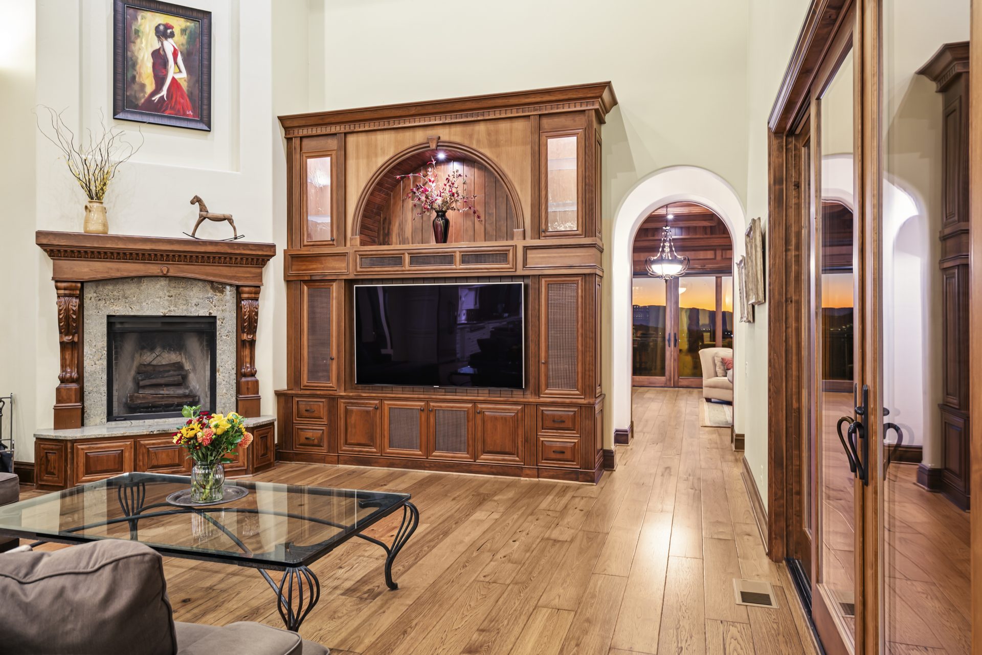 The open-concept kitchen and great room deliver both sophistication and function. Anchored by an expansive granite island, the kitchen offers professional-grade appliances, custom cabinetry, ample storage, and an inviting bar for entertaining. The adjoining great room, with its 22-foot vaulted ceilings, features a classic Rumford fireplace and windows framing mountain and courtyard views. The courtyard itself serves as an outdoor extension of the living space—complete with fireplace, large television, water feature, and multiple areas for year-round enjoyment. A bright breakfast nook and a covered patio with built-in barbecue further enhance the home’s indoor-outdoor flow.