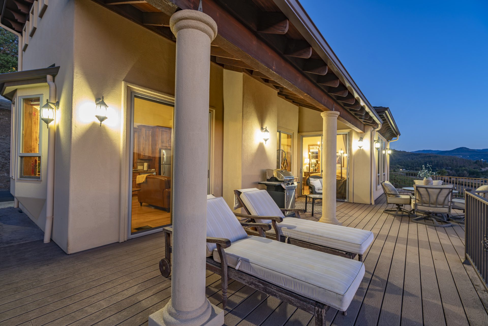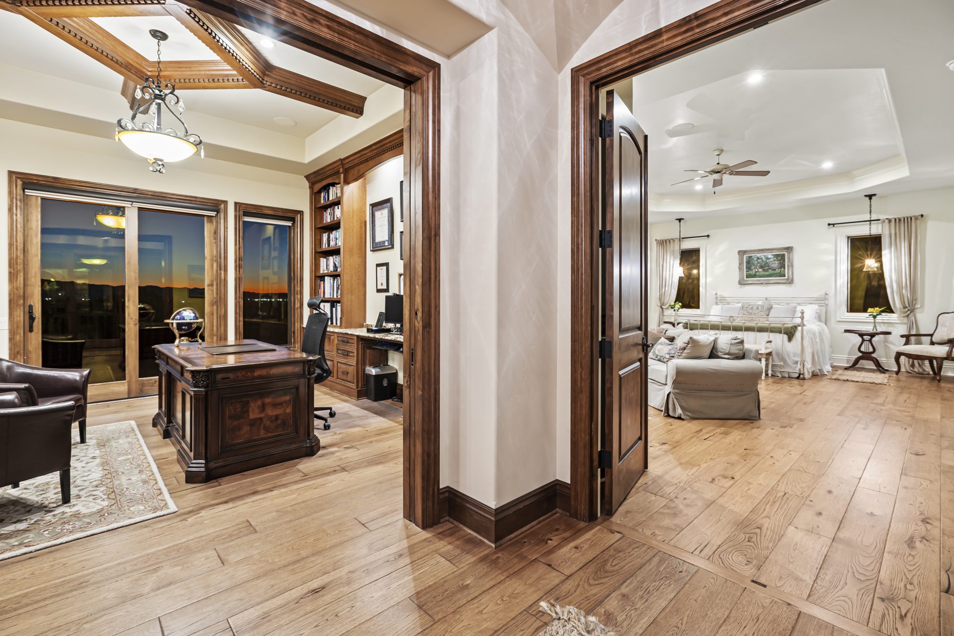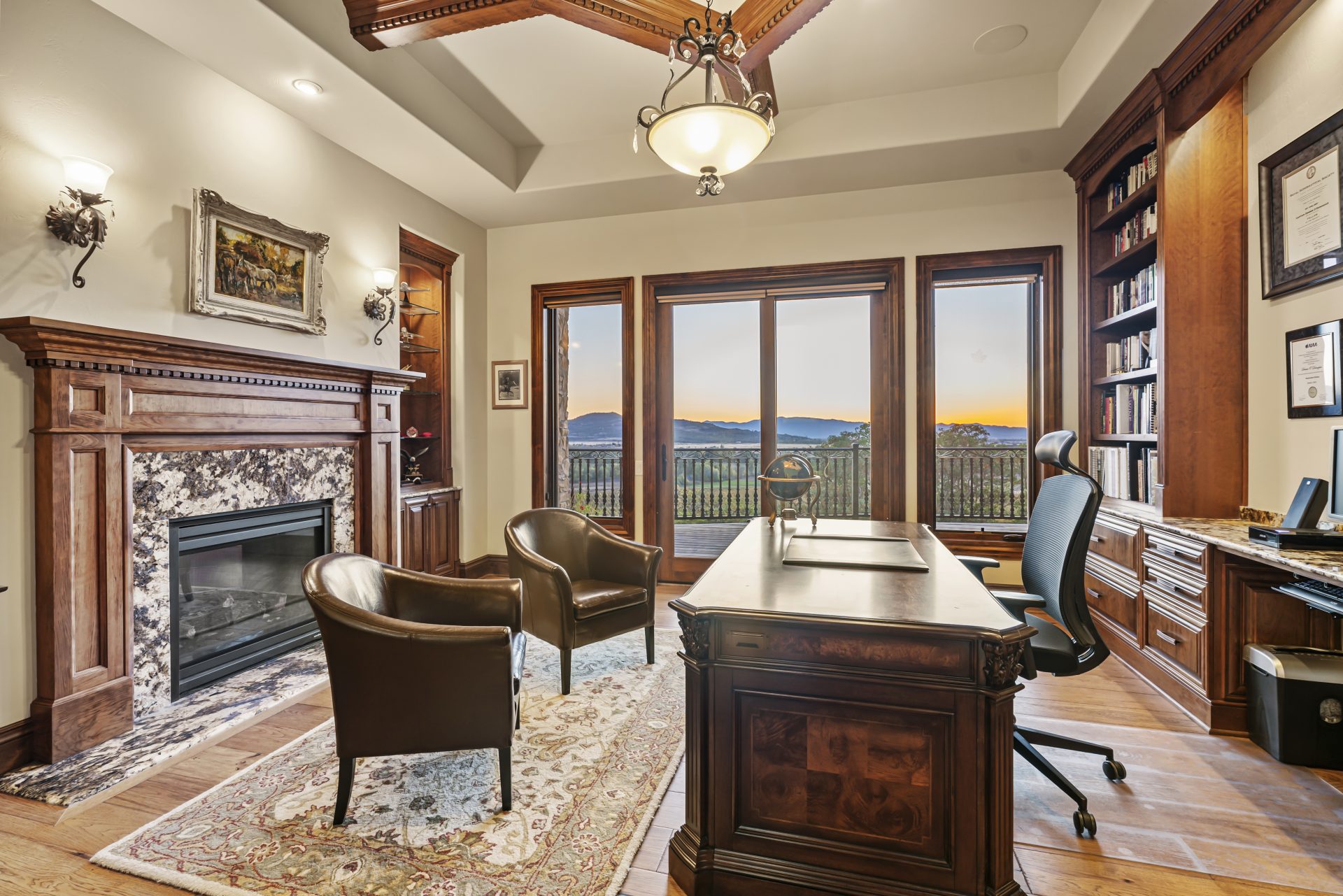To the west, the family room offers a warm and inviting atmosphere with a custom library, wet bar, and sweeping views of the vineyard and distant mountains plus french doors lead to the vineyard deck with great views. The adjacent executive office is an elegant workspace designed for both focus and inspiration.
