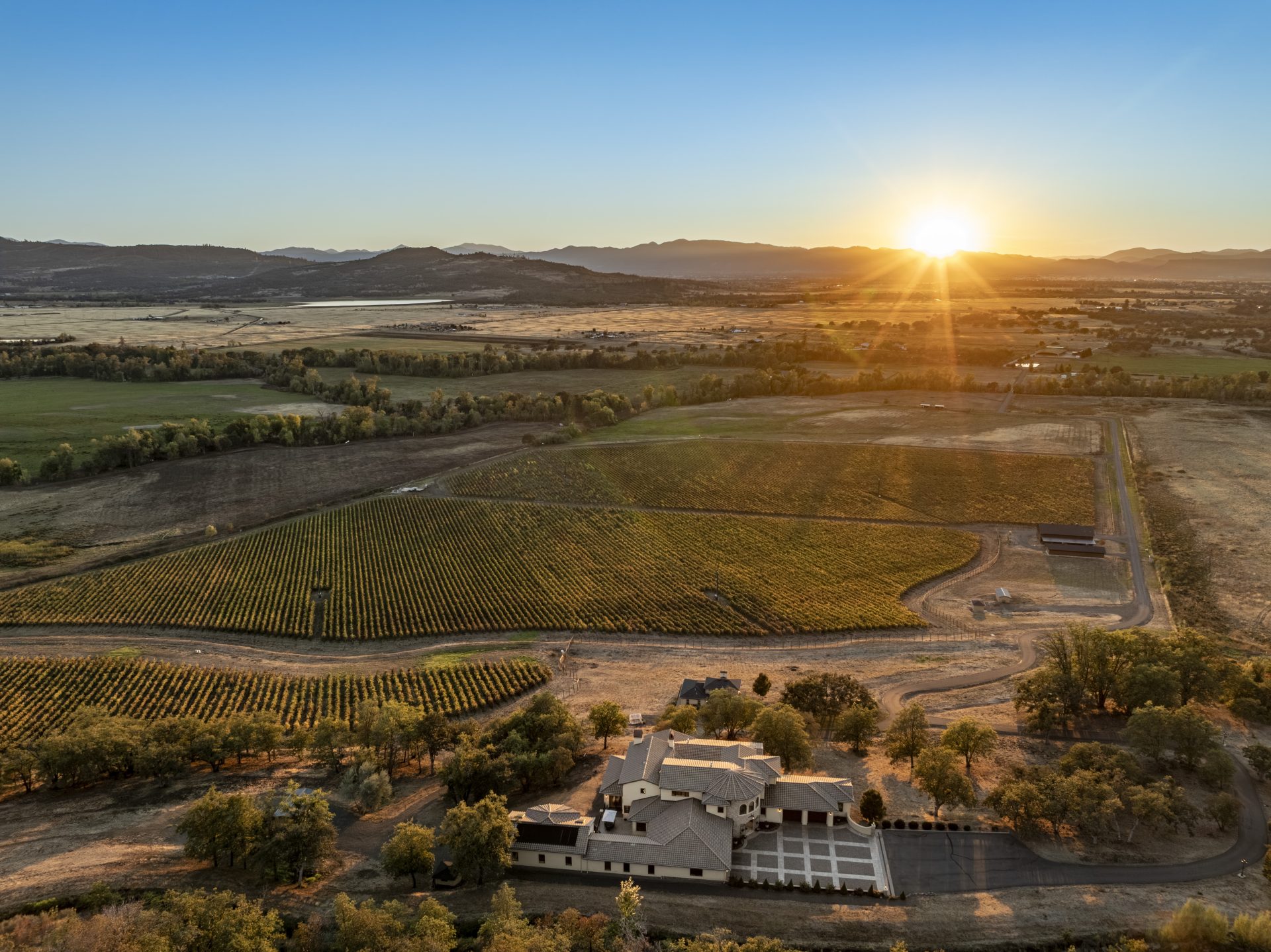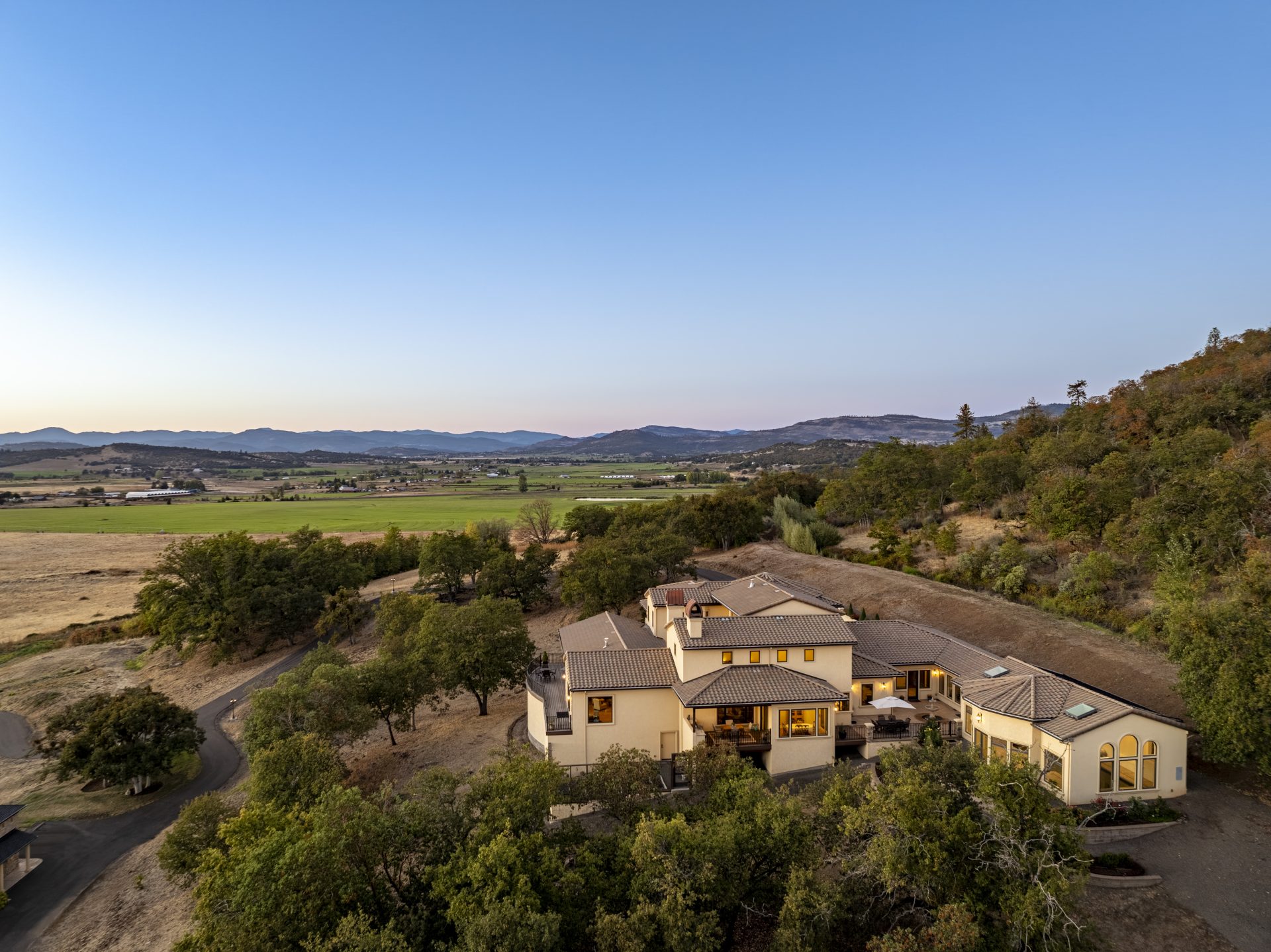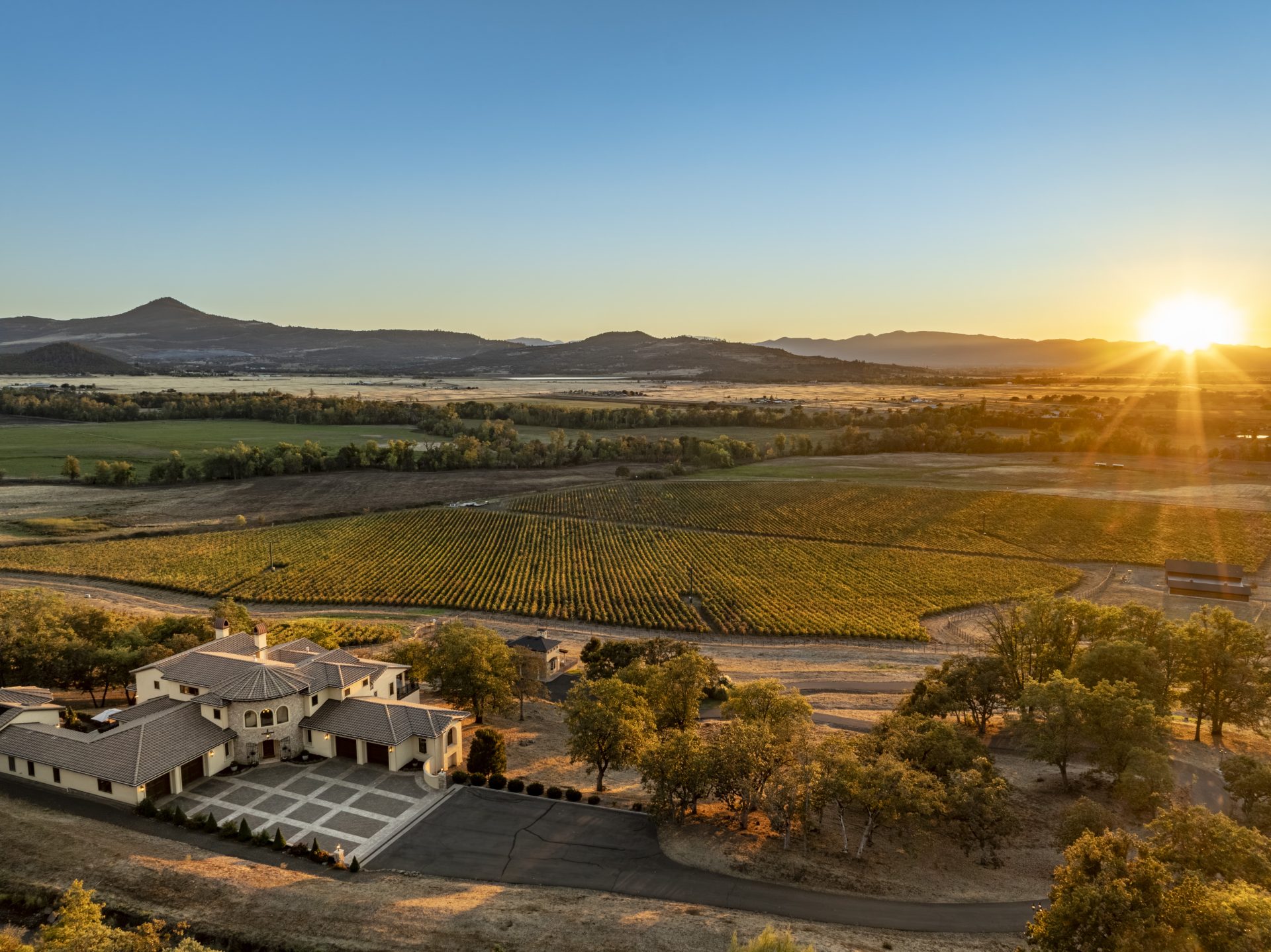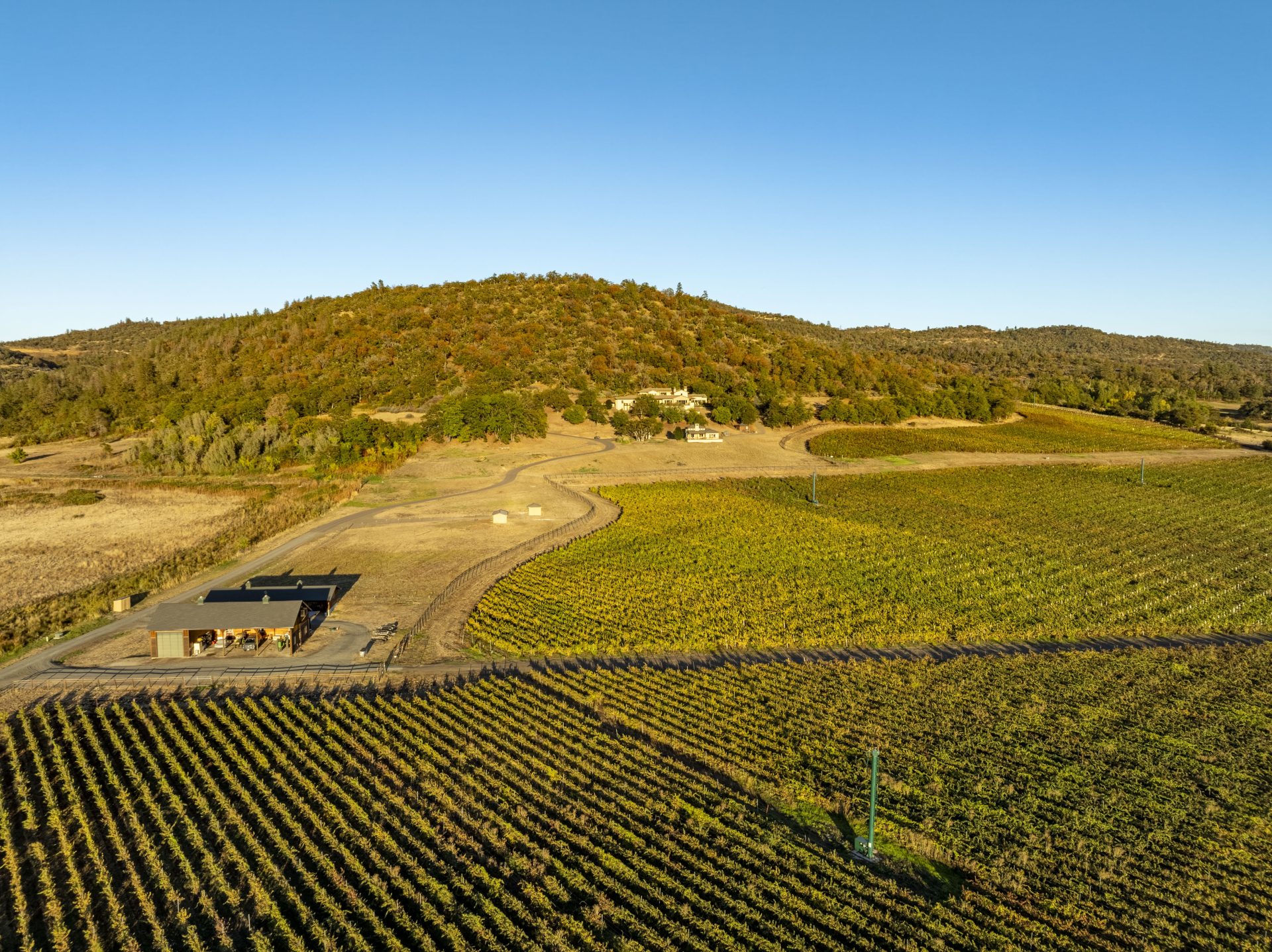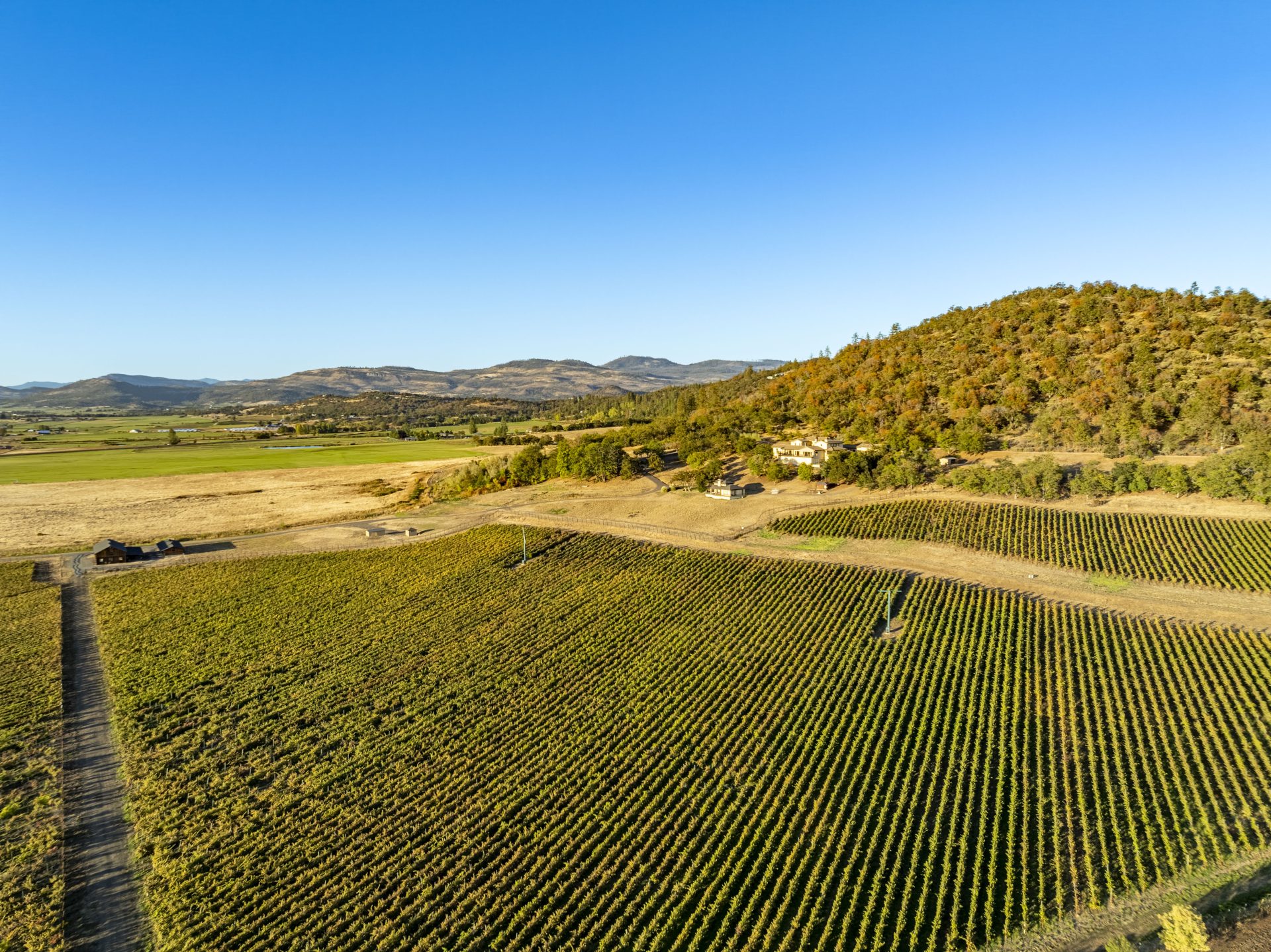 The property sits between 1,460 and 1,960 feet in elevation, with the home at about 1,600 feet. The land is level to gently rolling, with moderately steeper slopes above the residence offering scenic vineyard and mountain views.