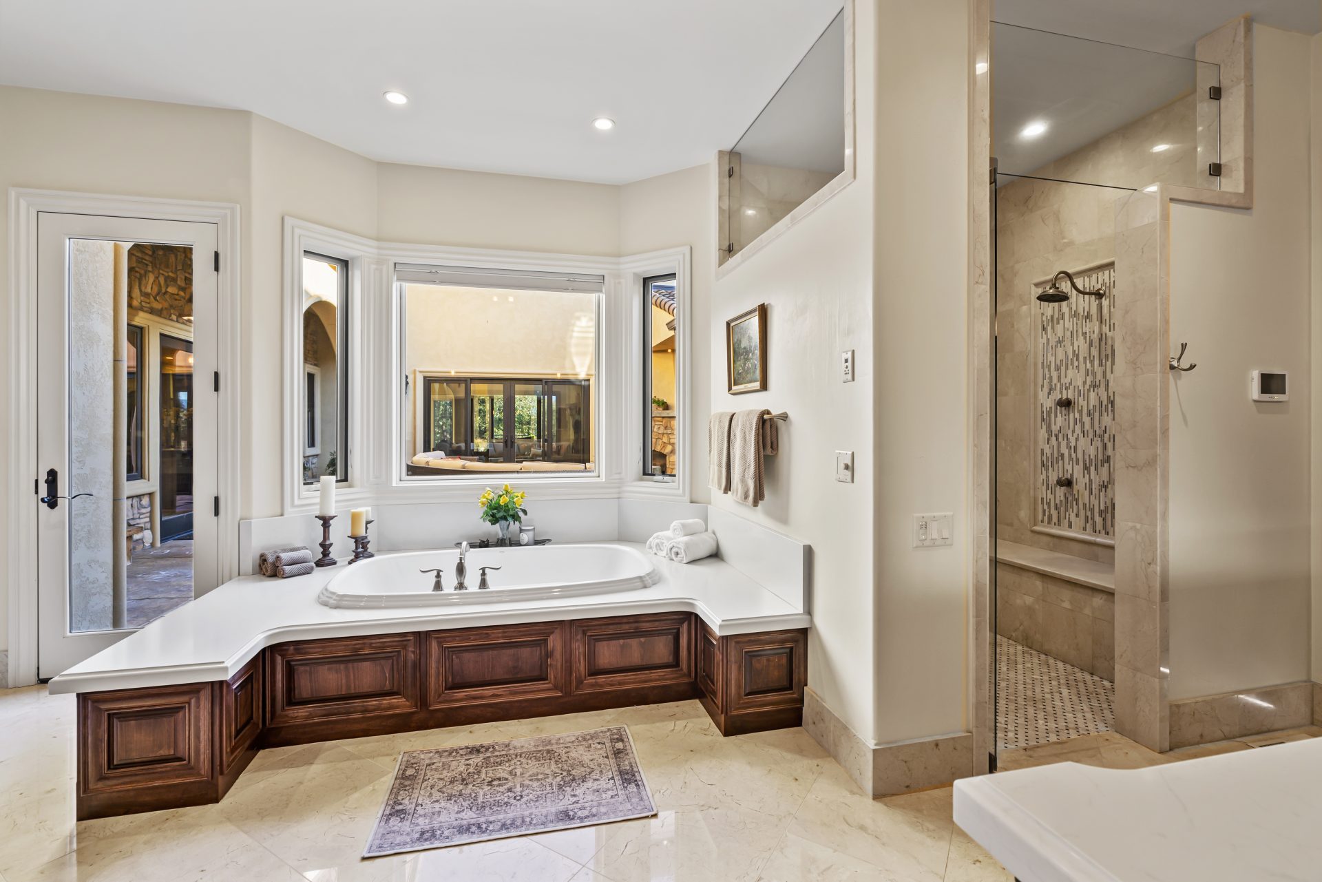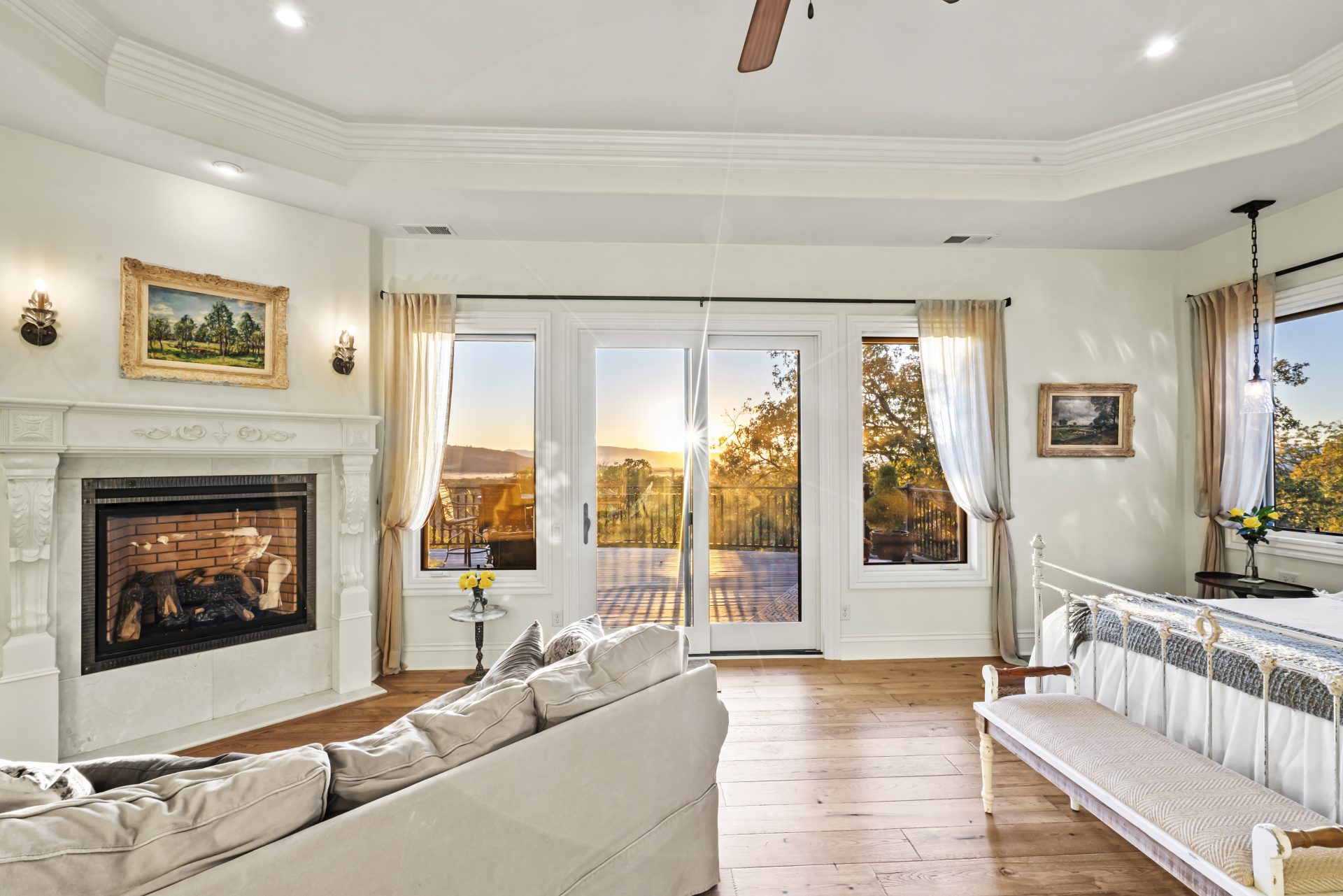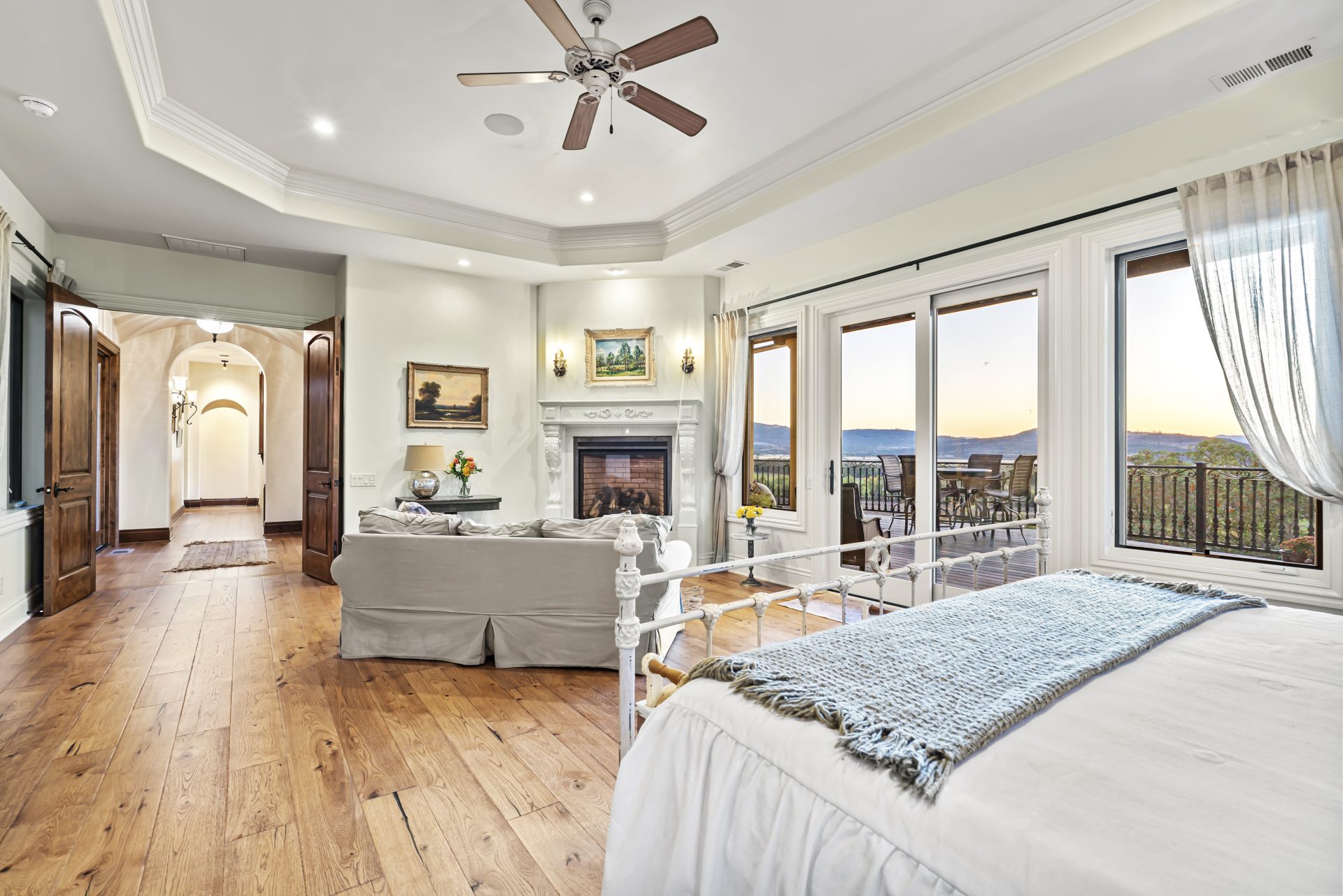 The primary suite completes this wing, providing a tranquil retreat. The spacious bedroom features a sitting area, fireplace, and direct access to the vineyard deck where the valley and mountain vistas unfold. The spa-like bath includes dual custom vanities, a large walk-in tile shower, jetted soaking tub, and heated floors. A luxurious walk-in closet with built-ins connects discreetly to a secondary entrance near the foyer and main garage for convenience.