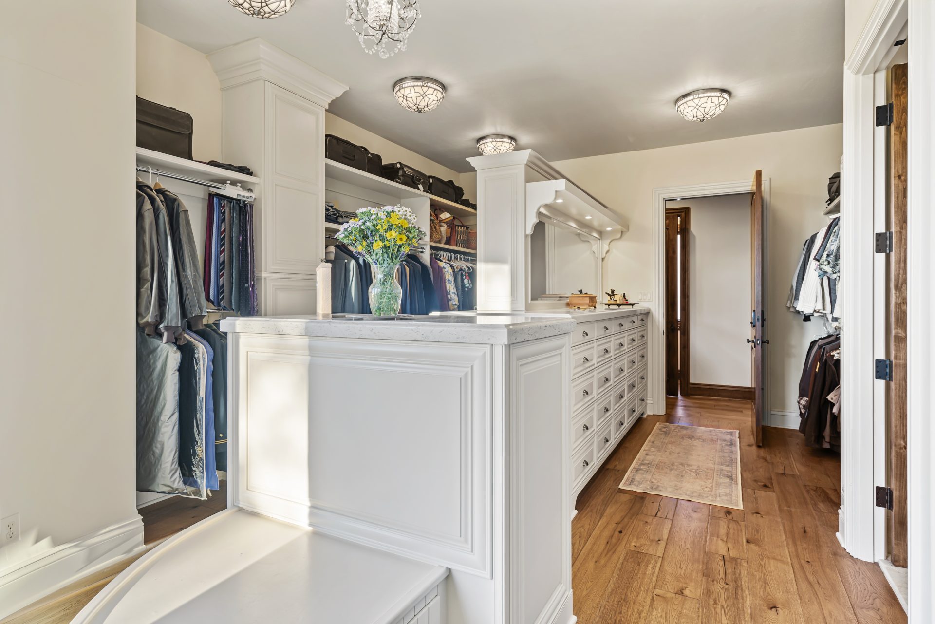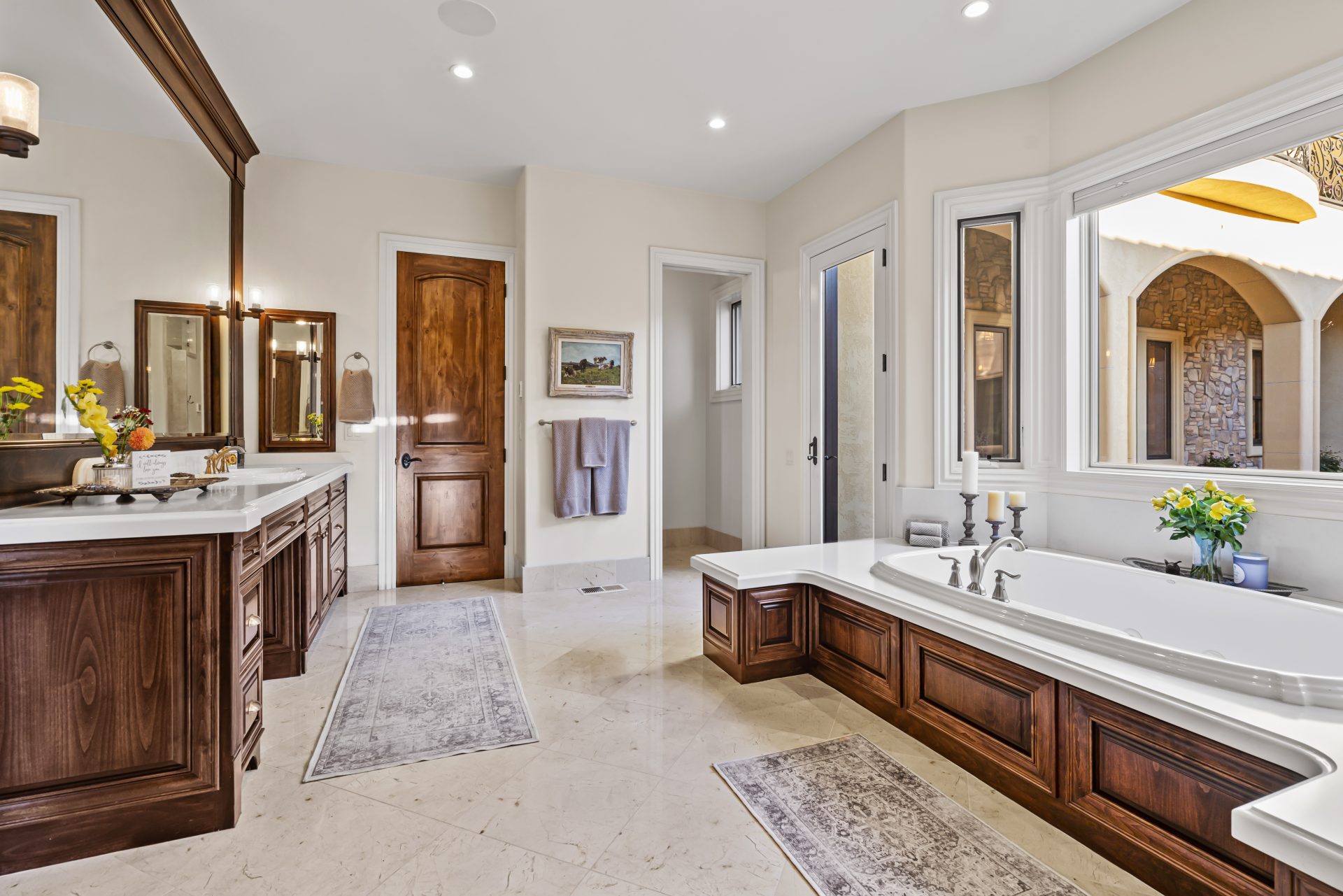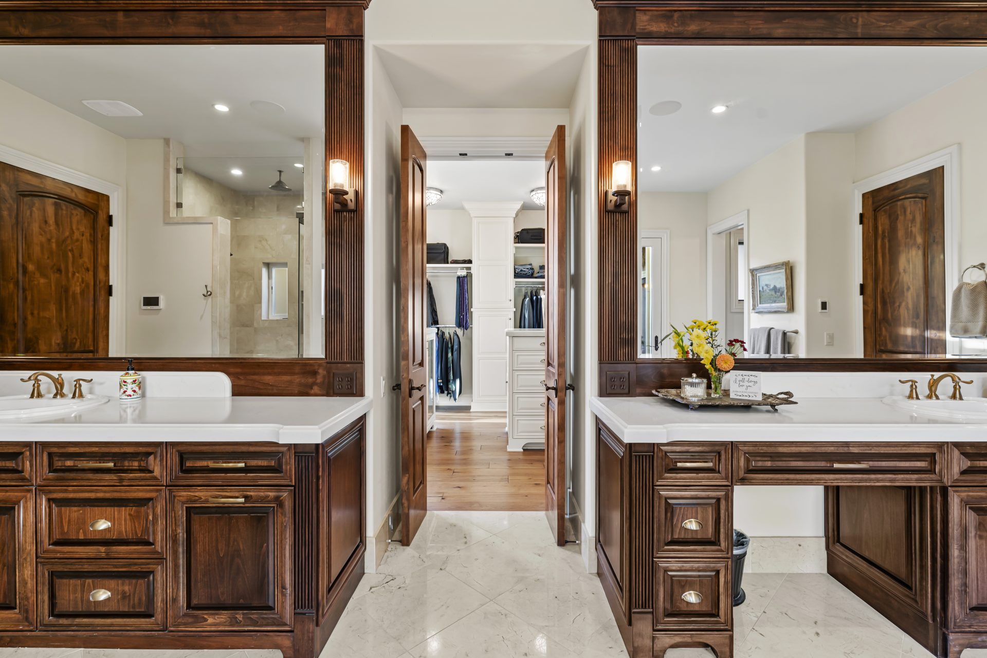 The primary suite completes this wing, providing a tranquil retreat. The spacious bedroom features a sitting area, fireplace, and direct access to the vineyard deck where the valley and mountain vistas unfold. The spa-like bath includes dual custom vanities, a large walk-in tile shower, jetted soaking tub, and heated floors. A luxurious walk-in closet with built-ins connects discreetly to a secondary entrance near the foyer and main garage for convenience.