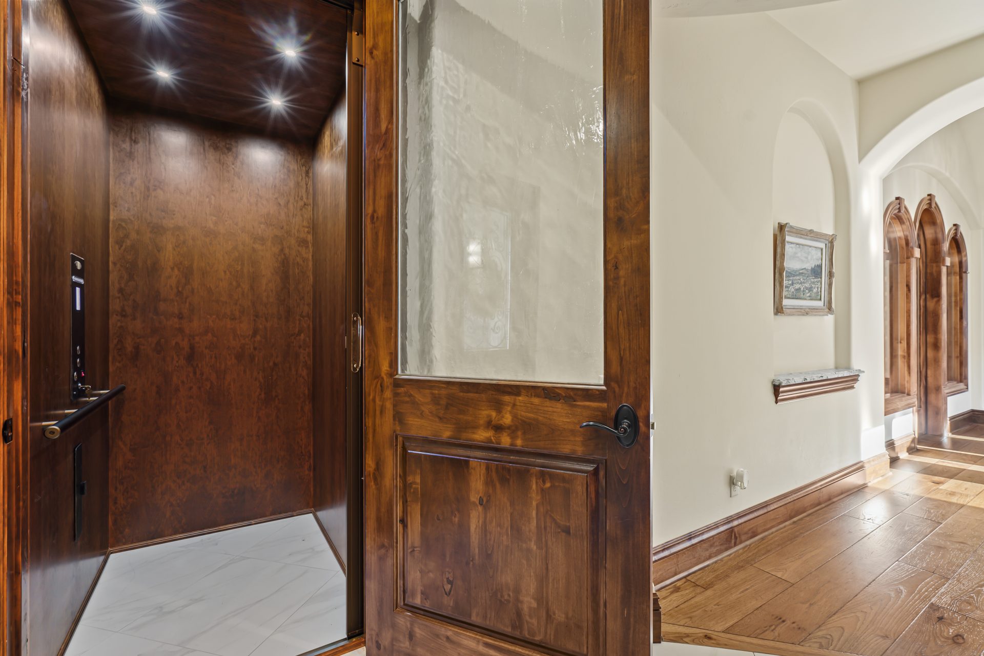 Upon arrival, the grand entry immediately sets the tone with marble flooring, an elegant circular staircase, a private elevator, and soaring 27-foot cathedral ceilings. Natural light fills the home, illuminating intricate woodwork and refined finishes that flow throughout the main level.