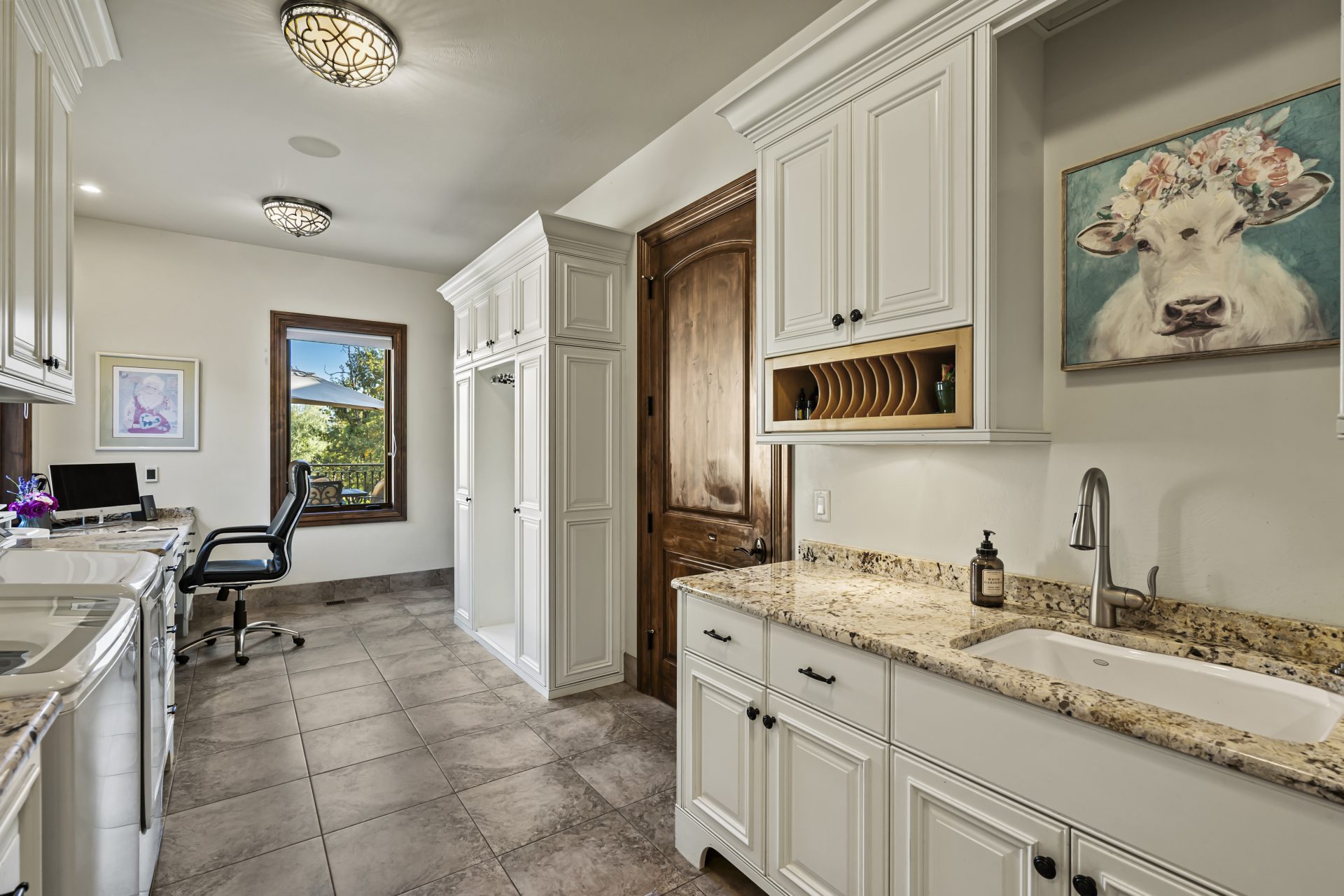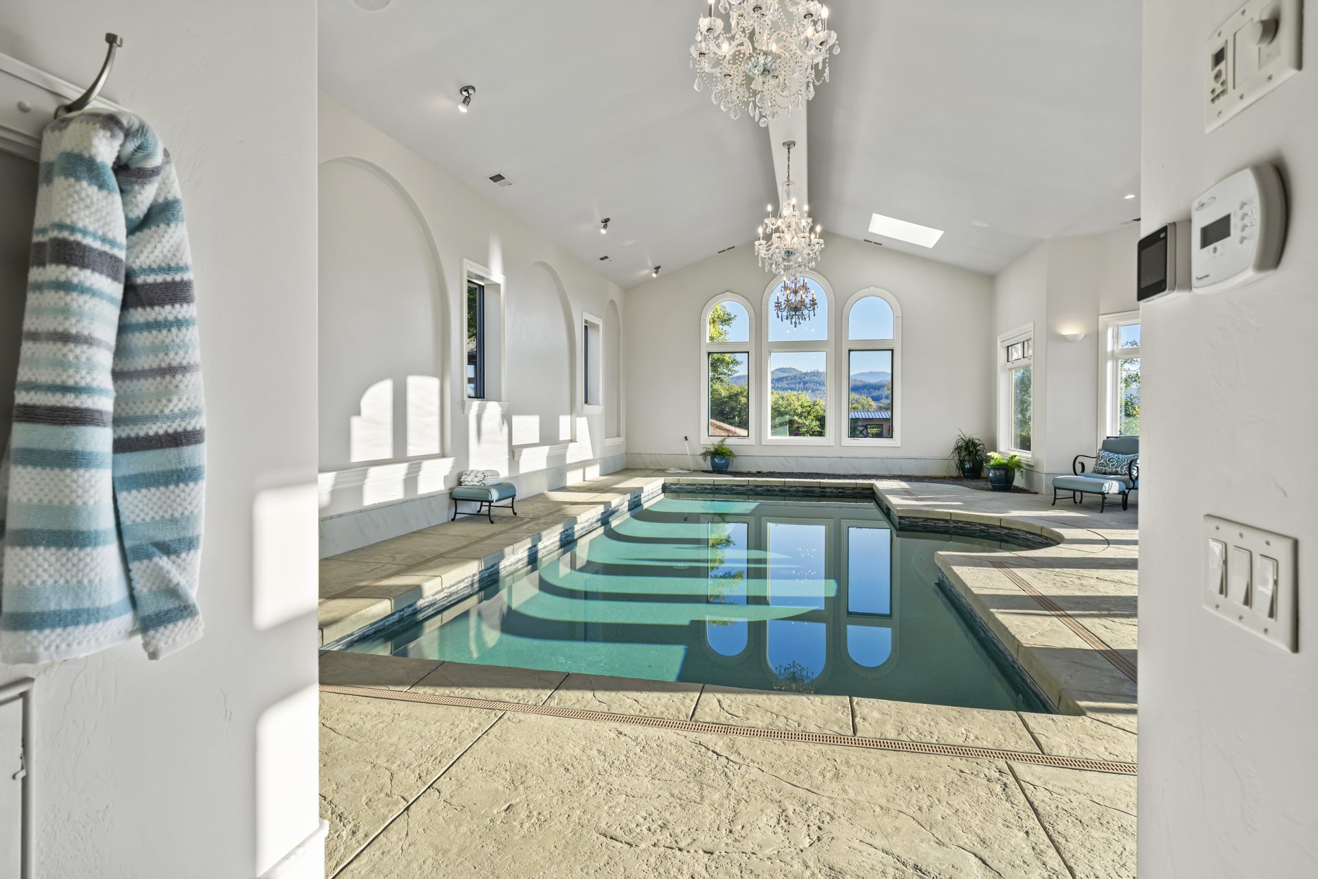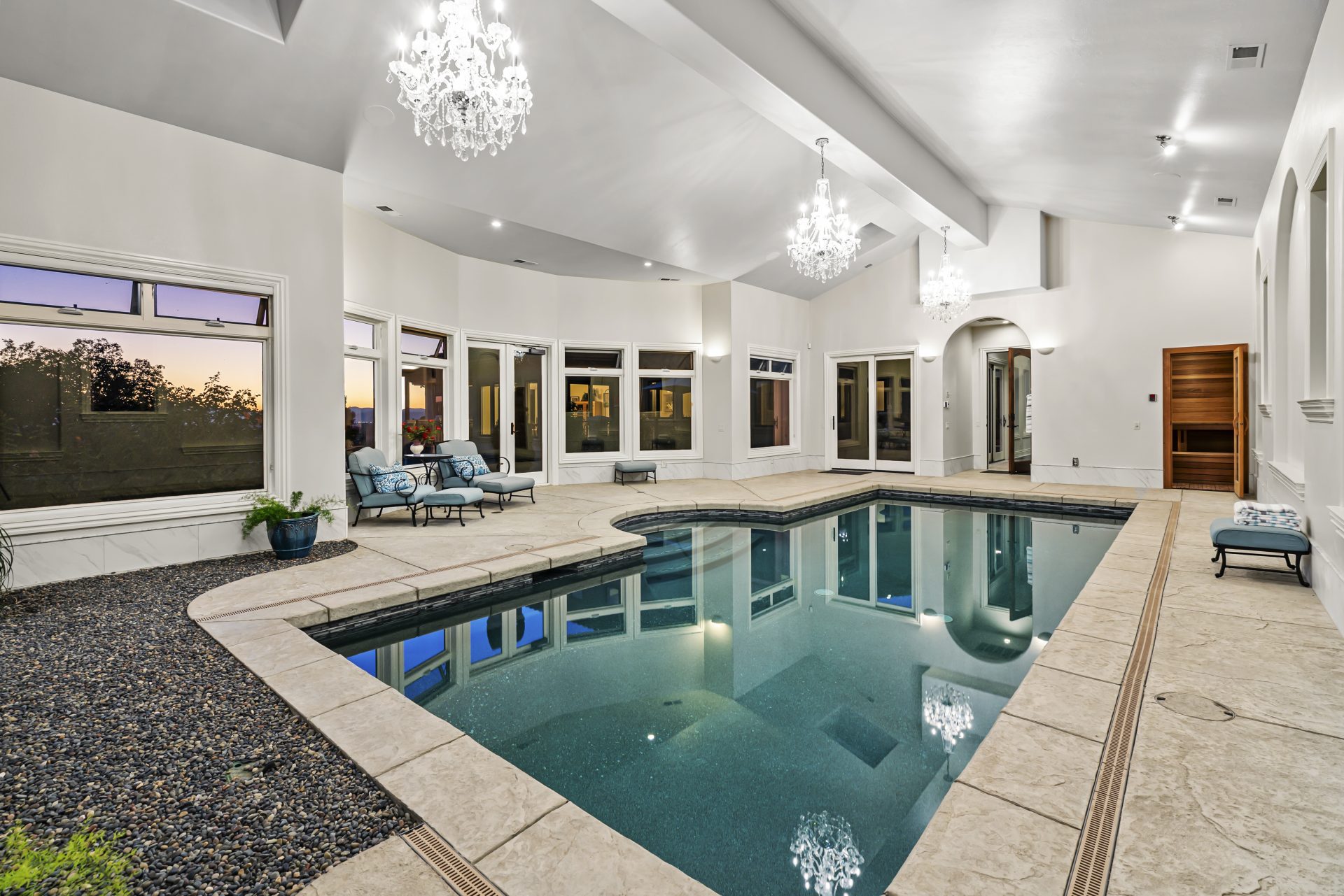 The eastern wing of the main level includes a large utility and laundry room with mudroom, second office, and powder bath, plus direct access to the second garage. The adjoining recreation space includes a gym, full bath, infrared sauna, and an impressive indoor Pebble Tec saltwater pool—heated by solar or furnace and supported by its own HVAC system. Outside, a large south-facing patio offers yet another inviting space for entertaining or quiet relaxation.